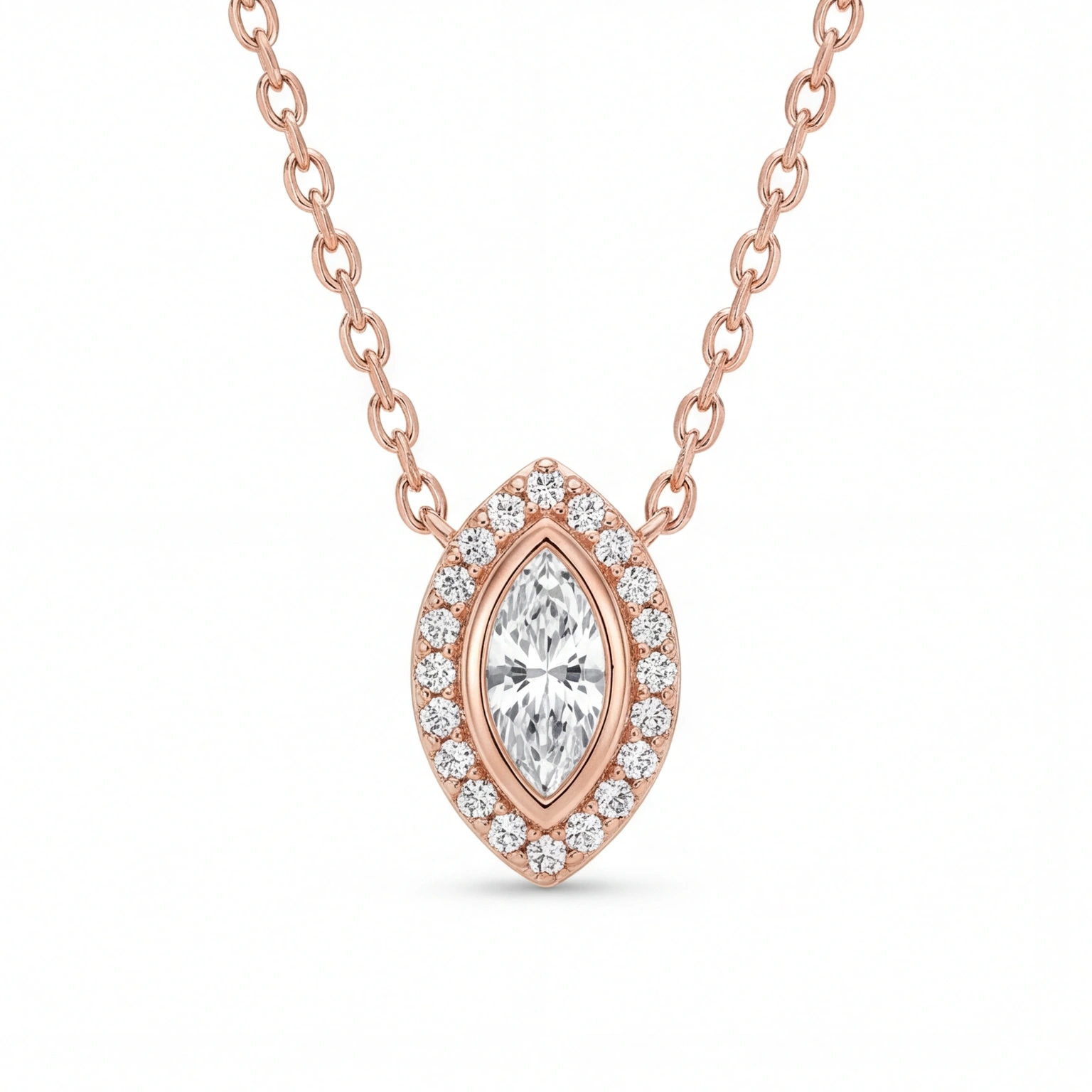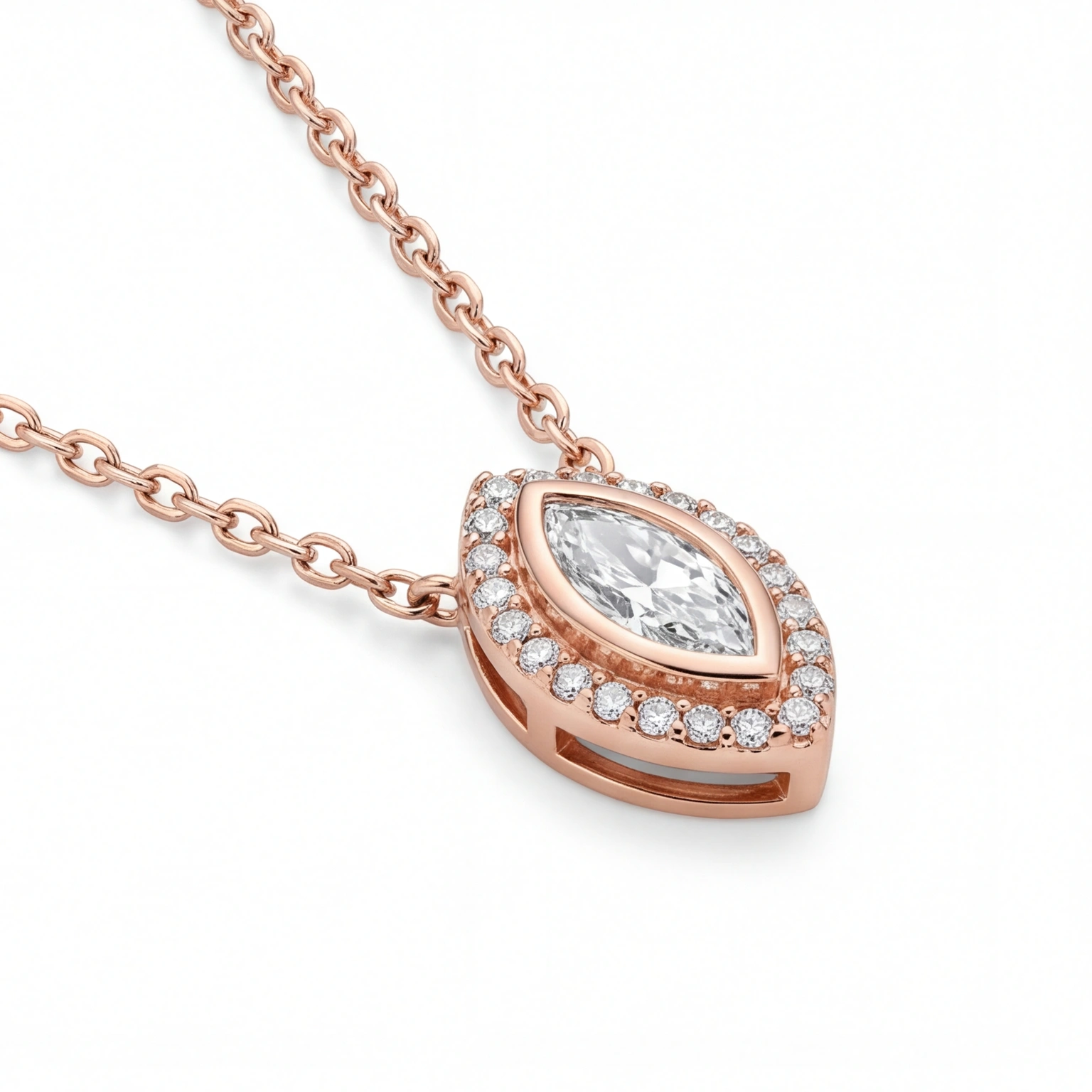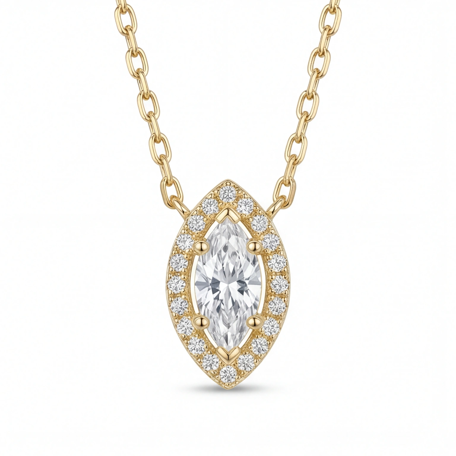 To draw attention to the sparkle of the stone, a circle of stones surrounds this marquise-shaped pendant. It is a piece with a chic glamour without feeling heavy because of the look that lays elegantly on the neckline. Ideal for evening style as well as everyday wear.