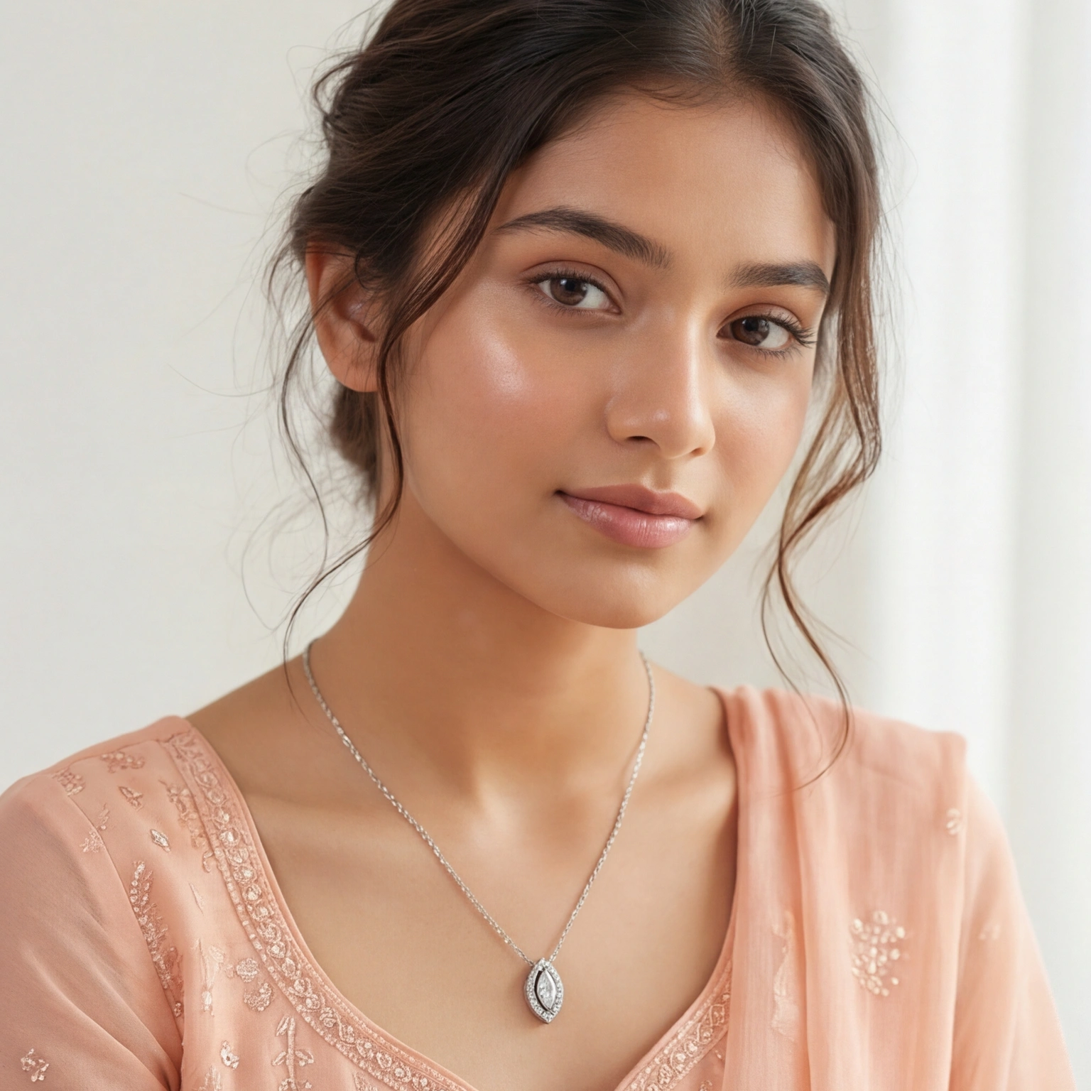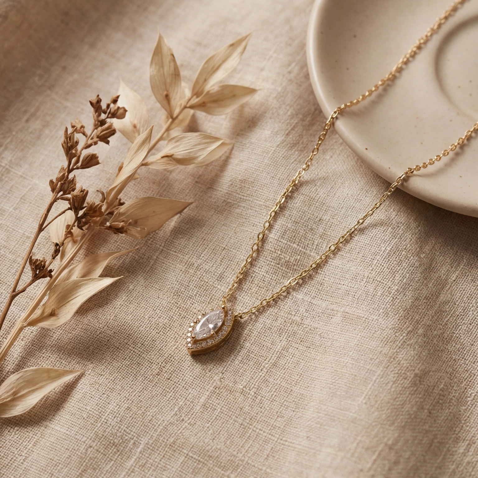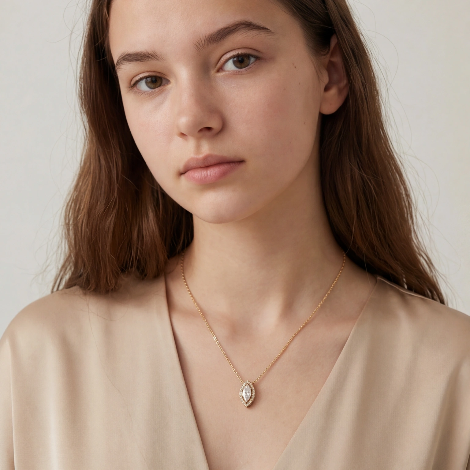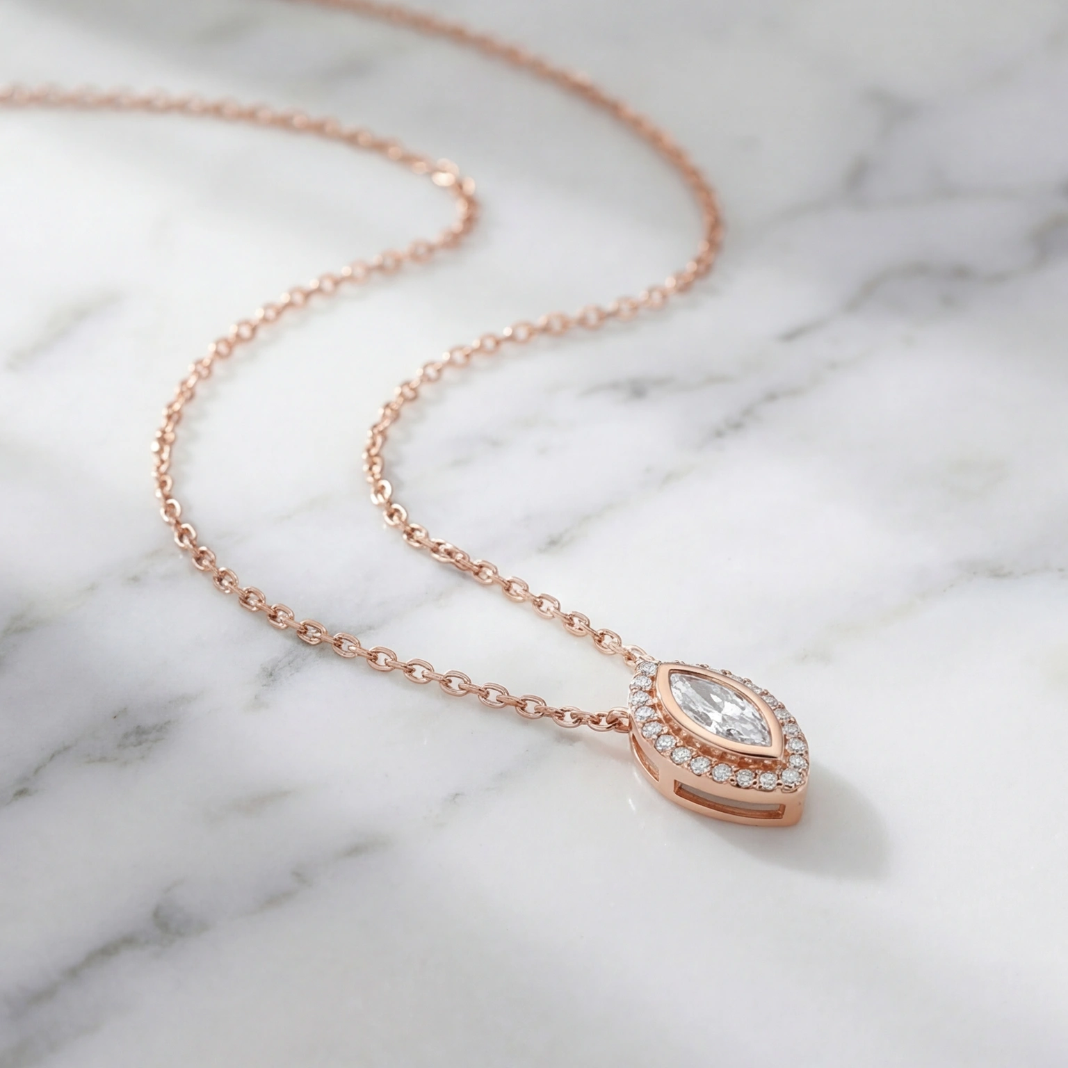 To draw attention to the sparkle of the stone, a circle of stones surrounds this marquise-shaped pendant. It is a piece with a chic glamour without feeling heavy because of the look that lays elegantly on the neckline. Ideal for evening style as well as everyday wear.