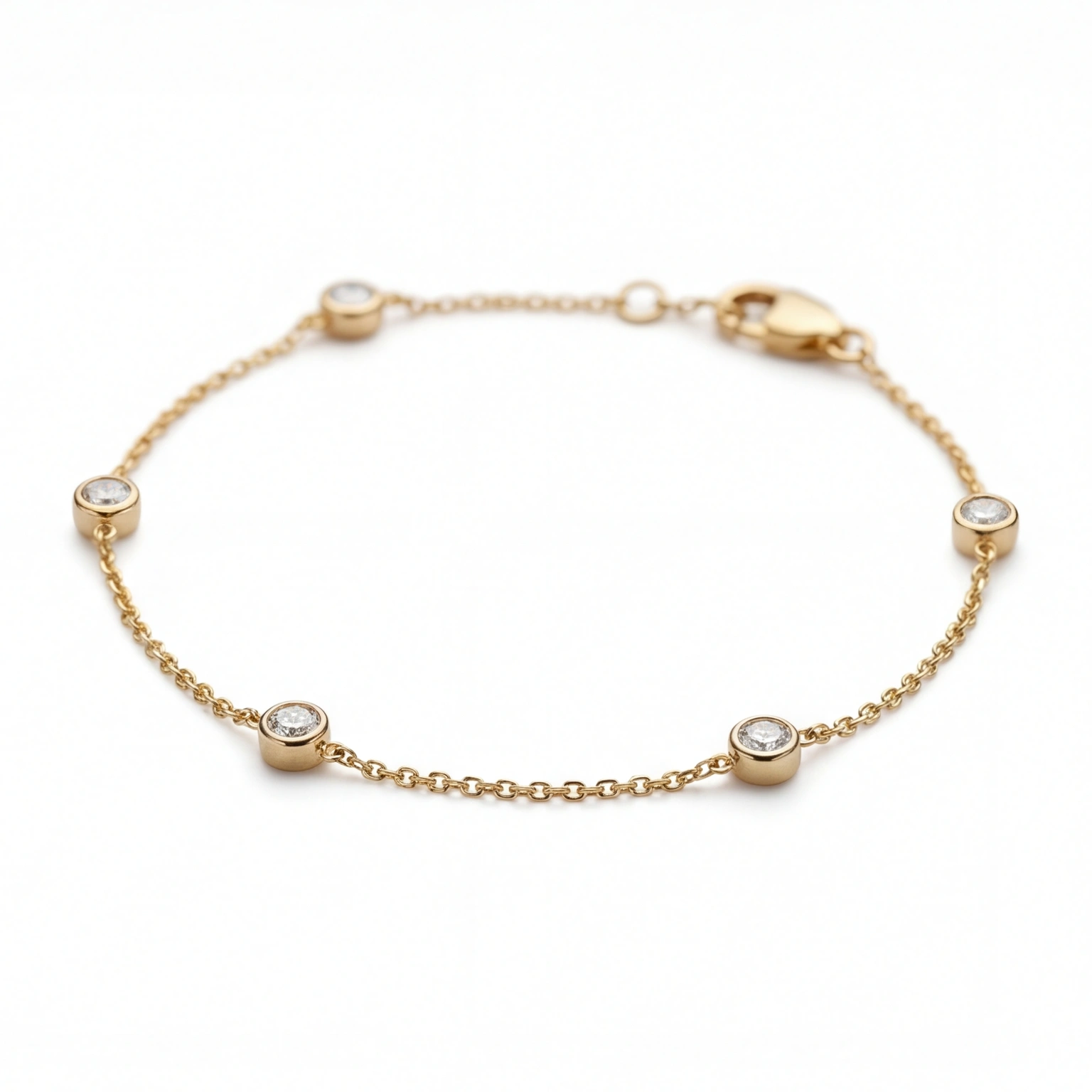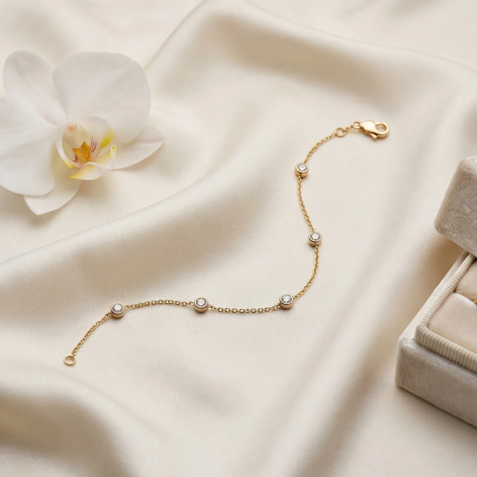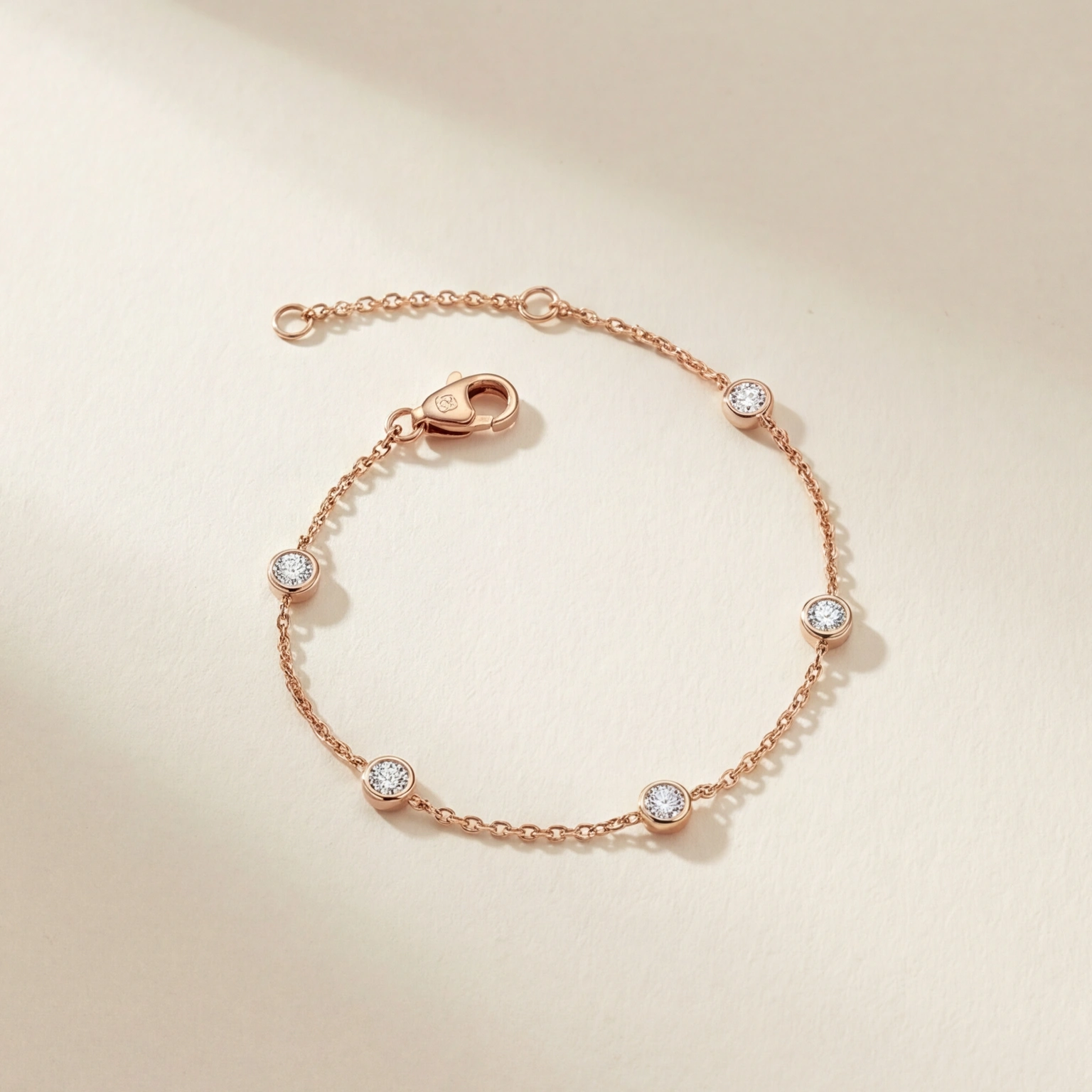 This tiny bracelet has bezel-set stones perfectly spaced along a fine chain, giving off gentle flashes with a neat finish. It’s designed for comfort and to be worn all the time, sitting gently on the wrist and pairing exquisitely with various other pieces.