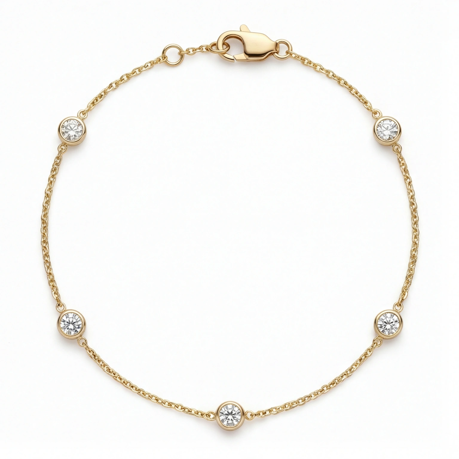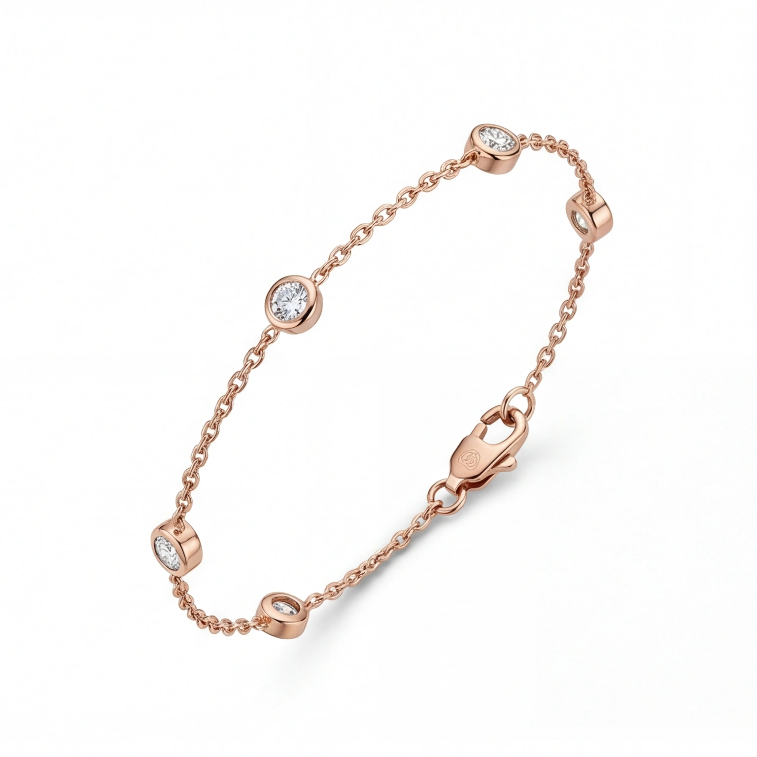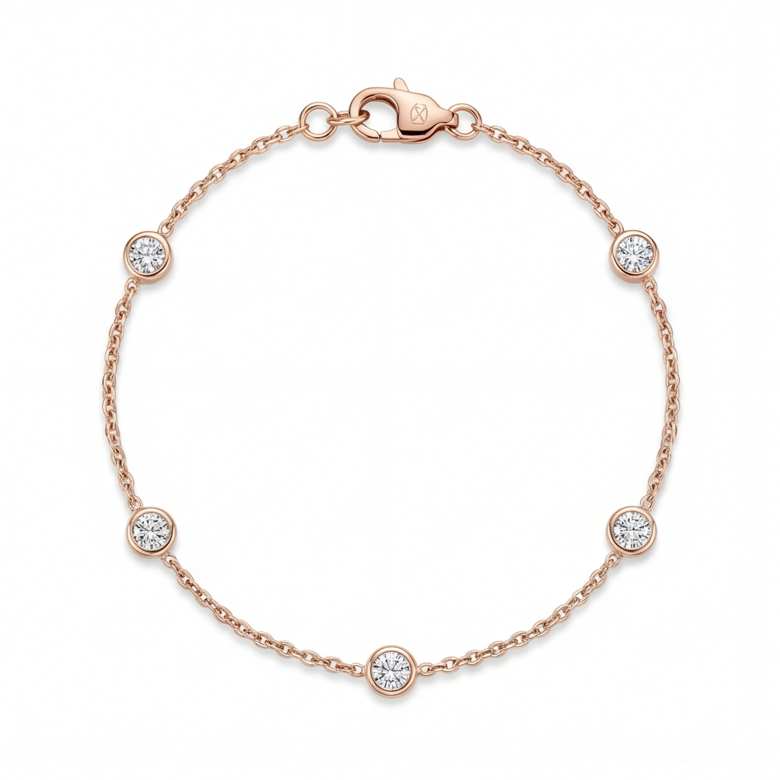 This tiny bracelet has bezel-set stones perfectly spaced along a fine chain, giving off gentle flashes with a neat finish. It’s designed for comfort and to be worn all the time, sitting gently on the wrist and pairing exquisitely with various other pieces.
