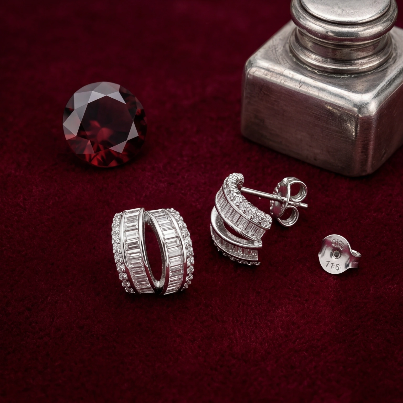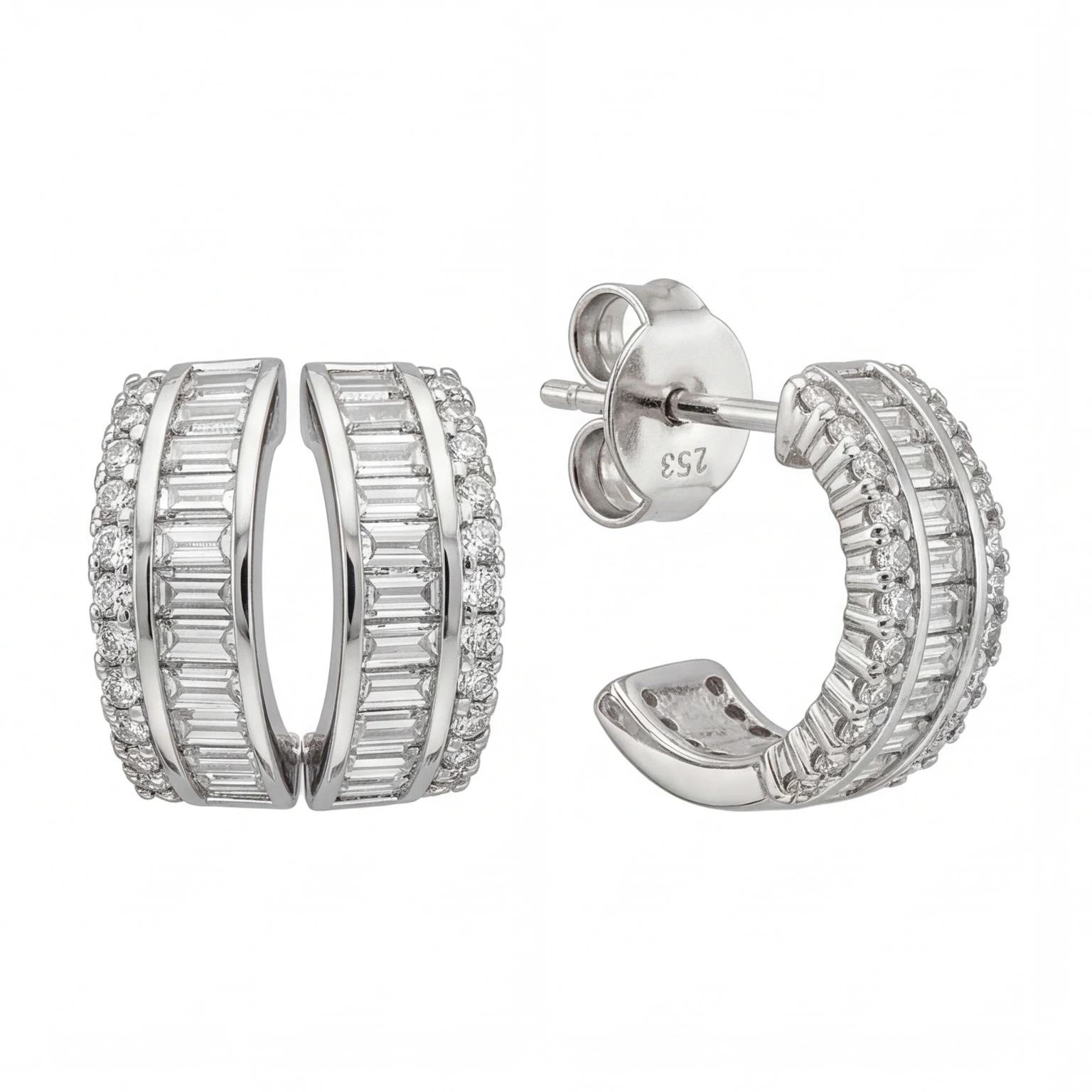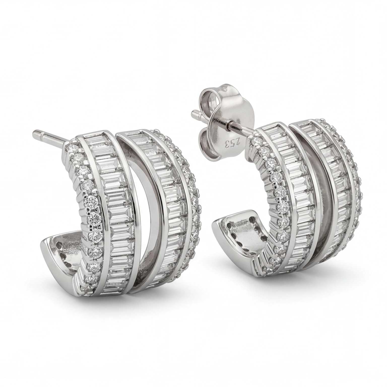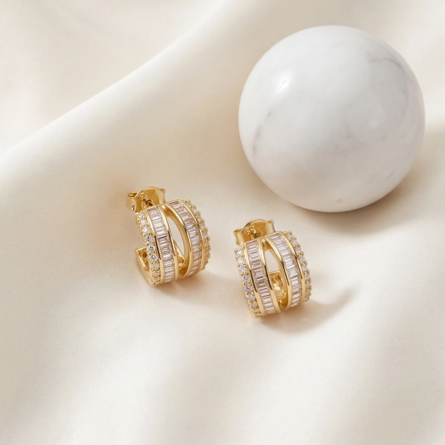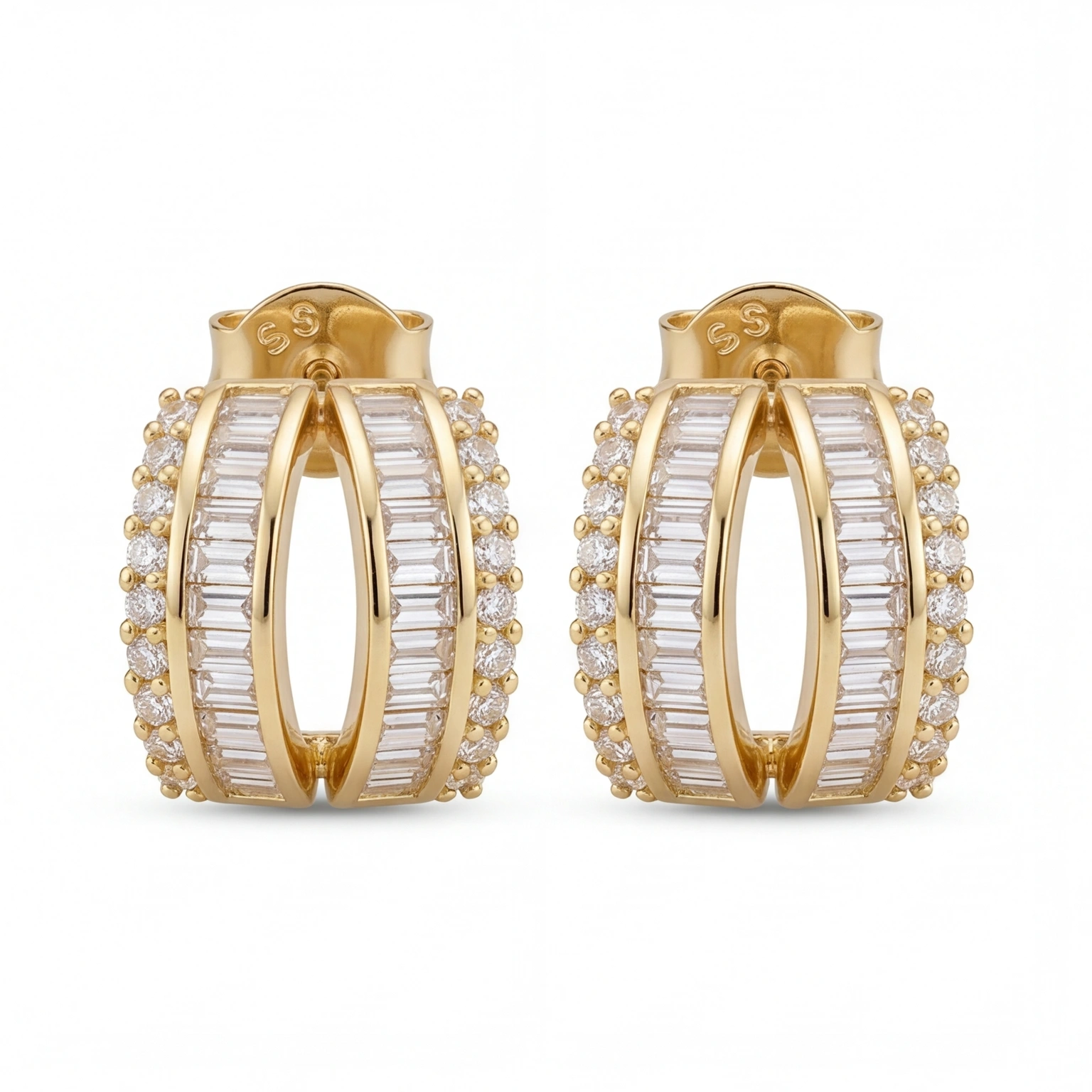 Two arched rows baguette CZs flanked by round brilliants packed into a compact hoop stud in warm gold. The Arch Studs are structured, sparkly, and surprisingly wearable for something this rich. From boardroom to dinner table, they just work.