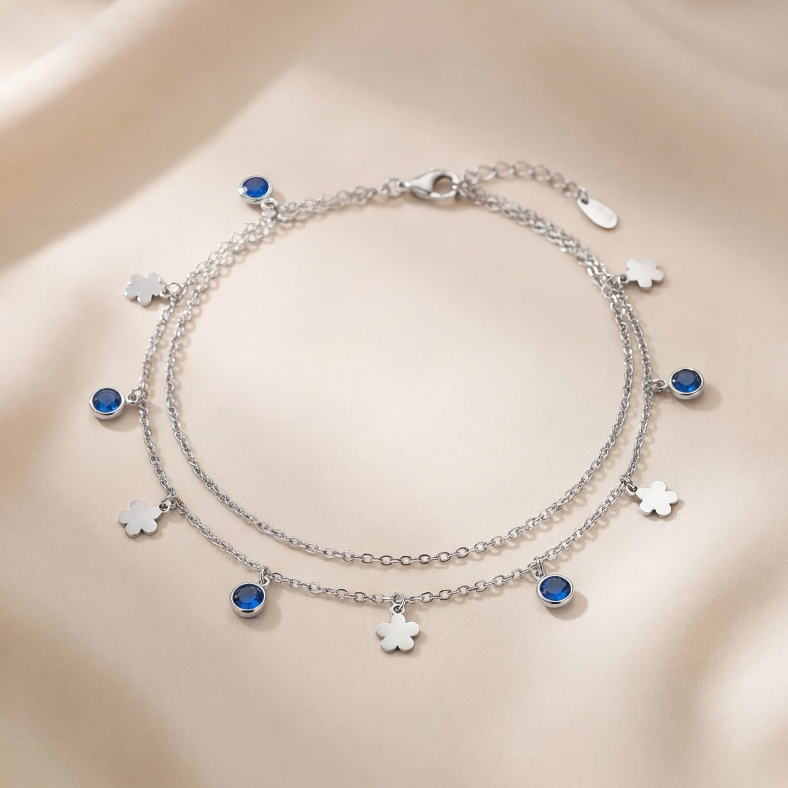 Two silver chains carry alternating bezel-set blue CZs and flat clover charms; a little something borrowed from the garden, a little something from the sea. The Blue Garden Anklet is playful, colourful, and completely summer. Worn solo or layered, it adds the kind of detail that makes people look down at your feet and smile.