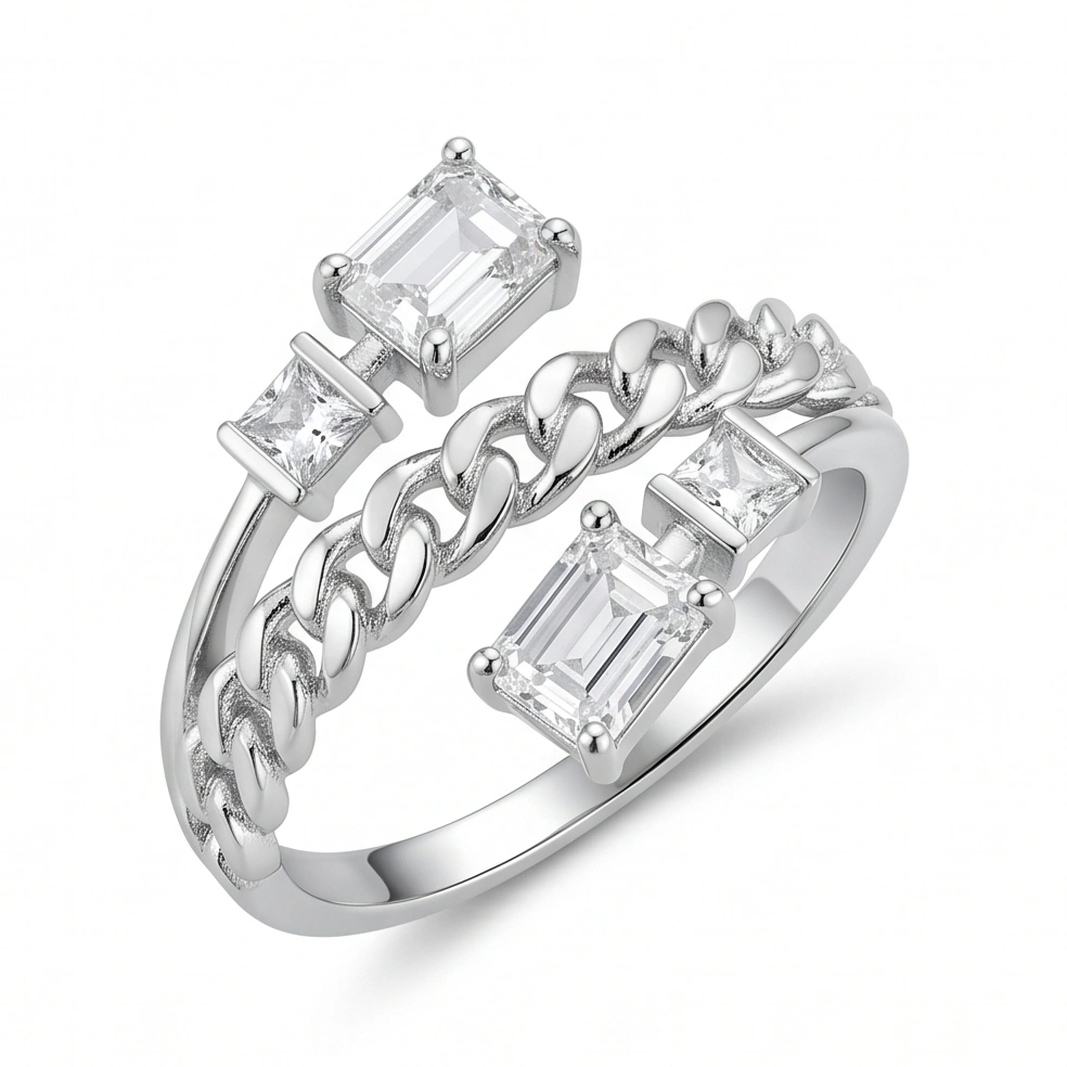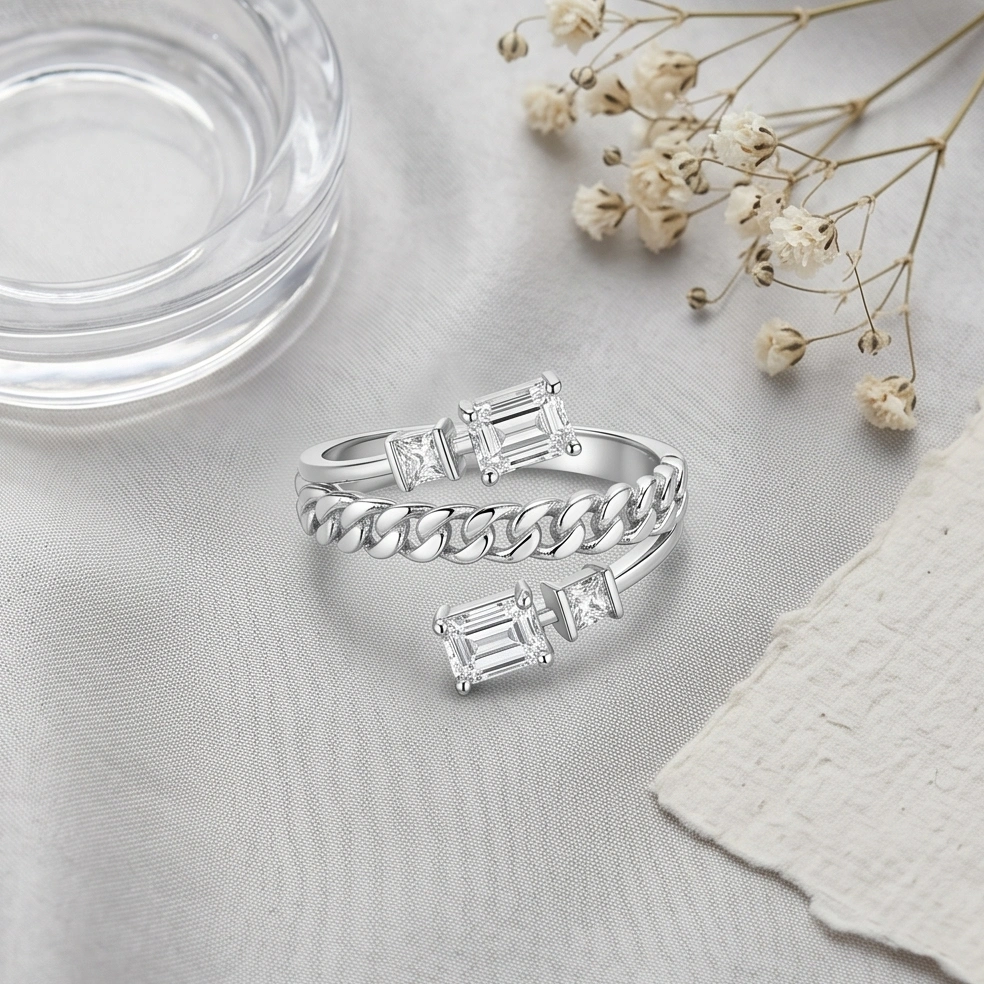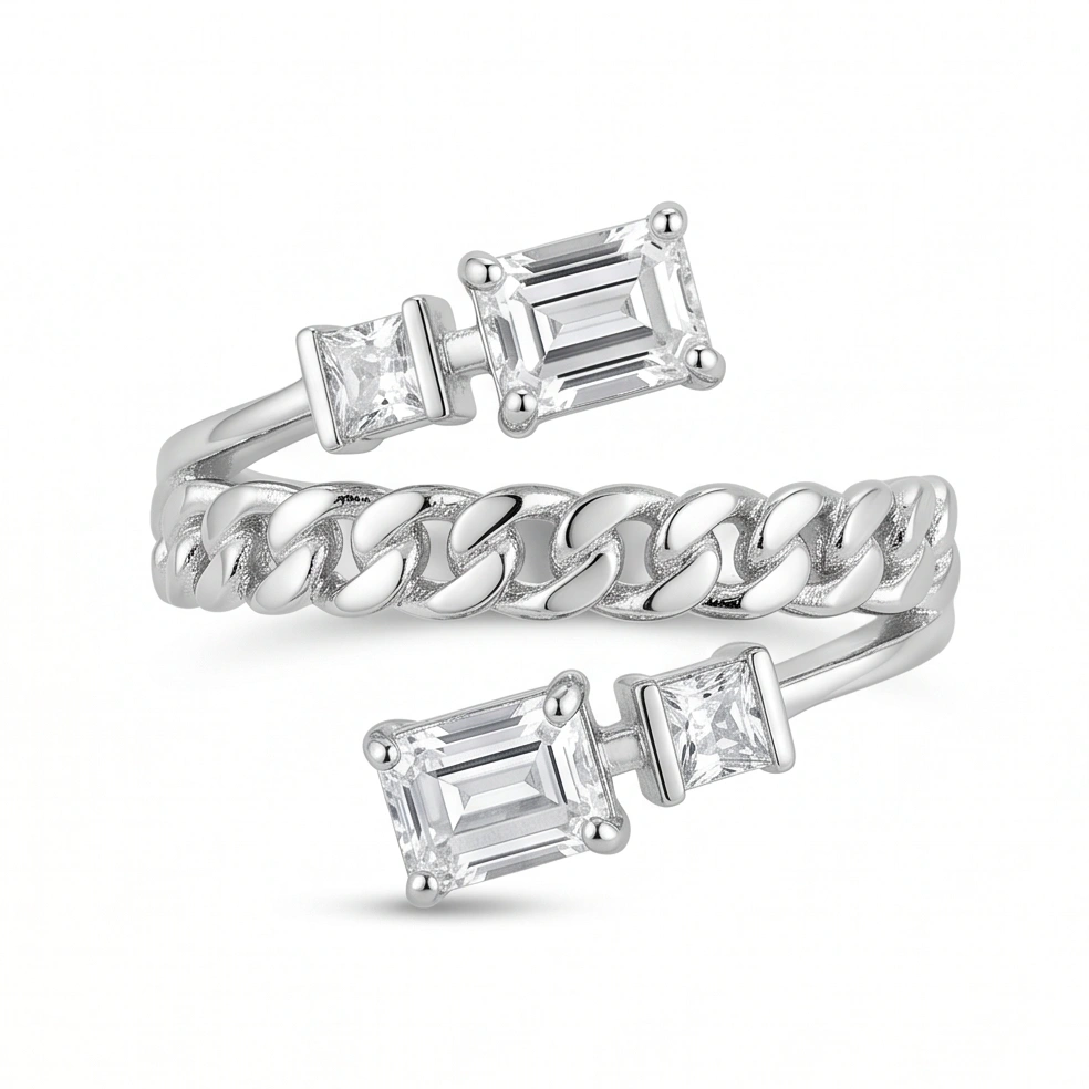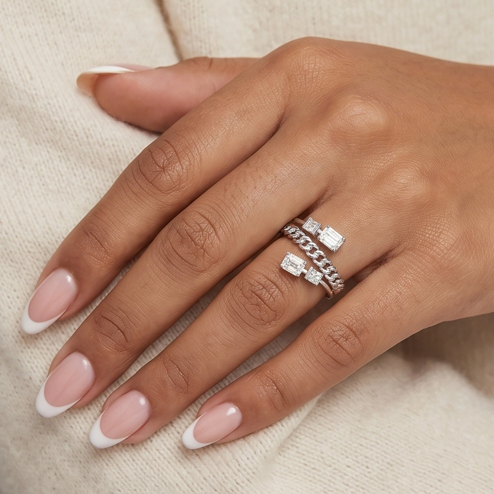 A chunky curb chain band paired with a delicate baguette duo ring β€” worn together as a stack that plays texture against texture. The contrast is the whole point. Street-smart, stone-set, unmistakably Cilvira.