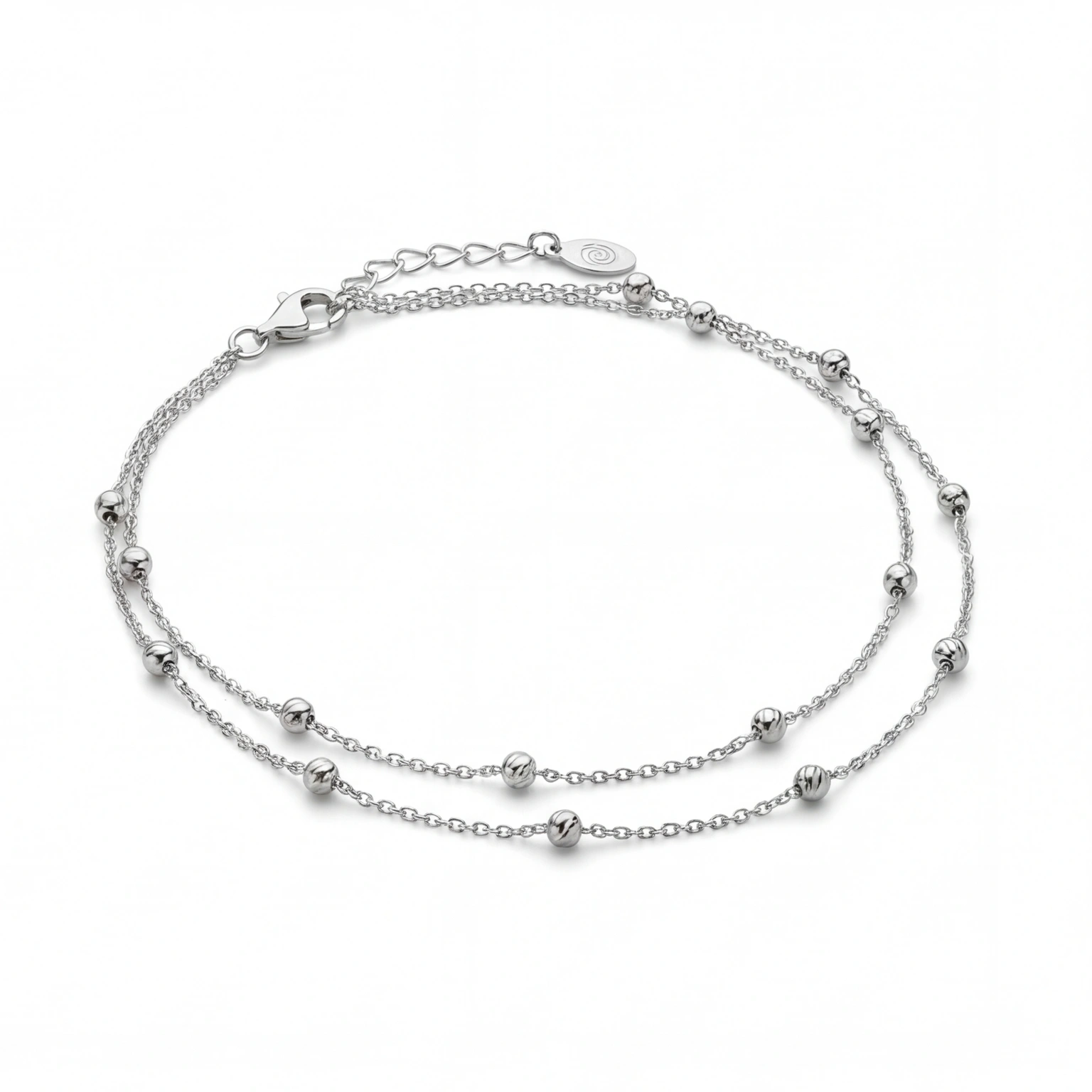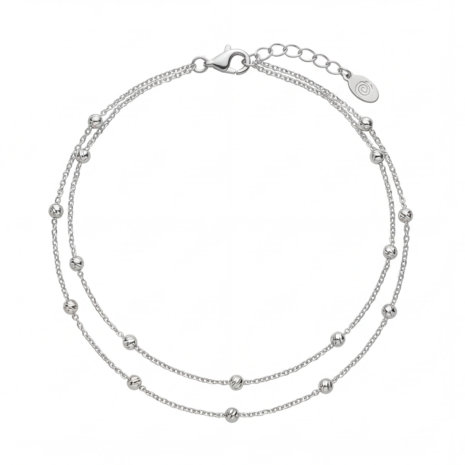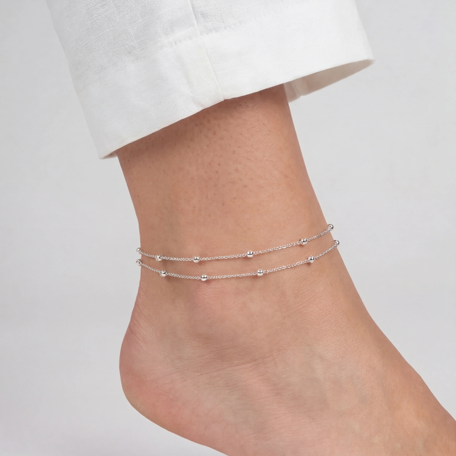 Two delicate silver cable chains run parallel, each punctuated with polished silver beads at even intervals. The Double Bead is simple by choice and beautiful by result. The kind of anklet that looks like you’ve had it forever, because once you put it on, you probably will.