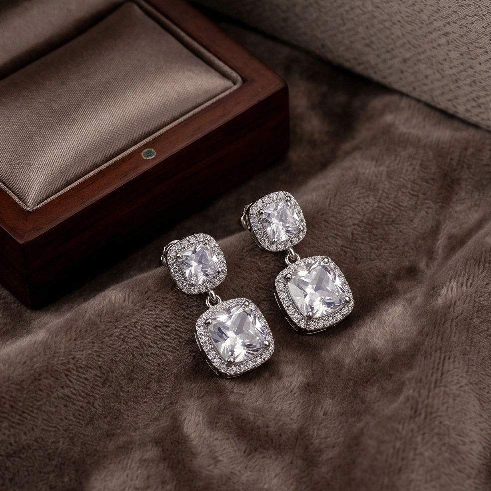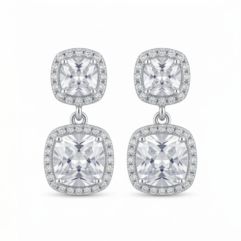 Two pavΓ©-halo cushion stones, one stacked above the other, the top a stud, the bottom a drop. Substantial without being loud, formal without being stiff. The earring you wear when you want the room to notice, quietly.
