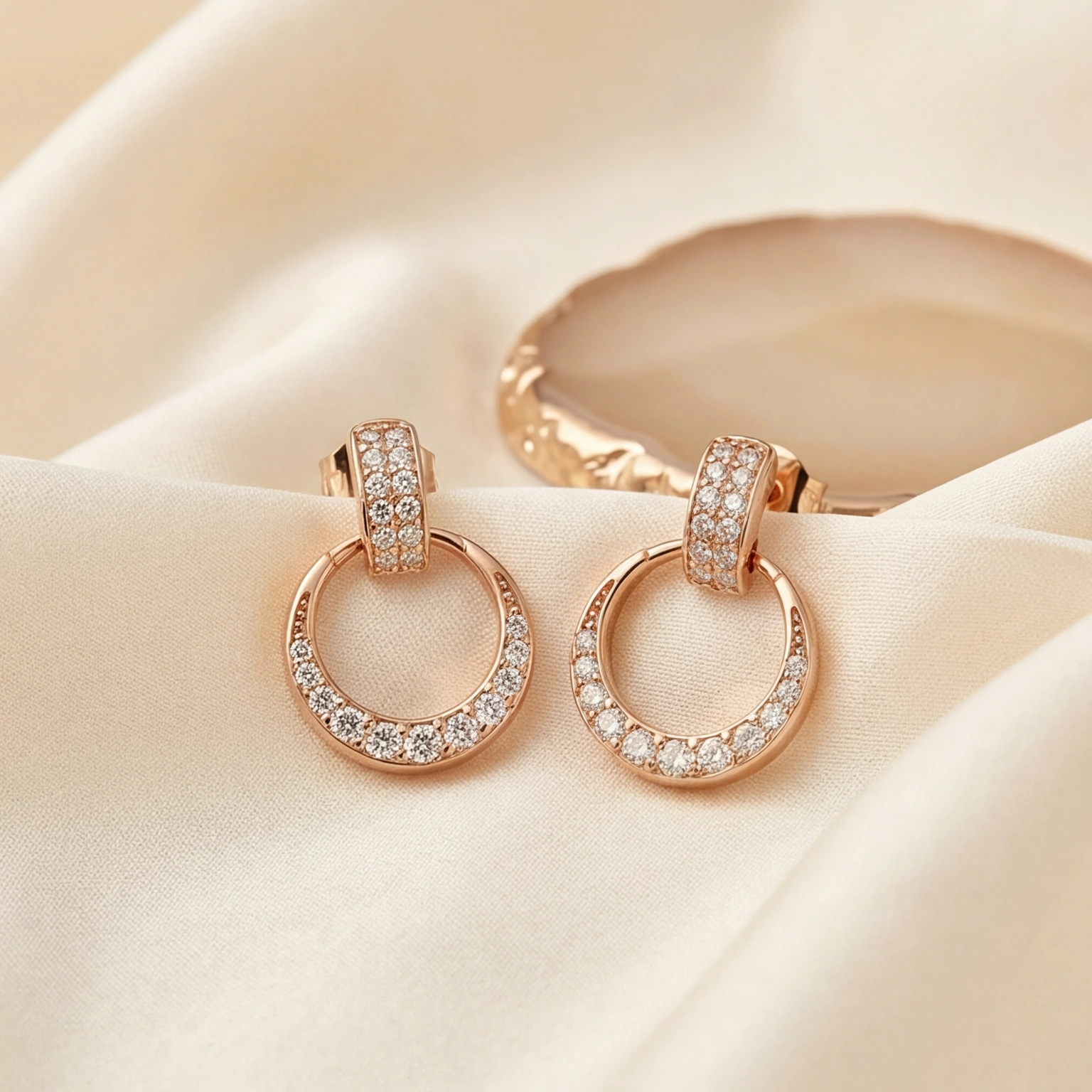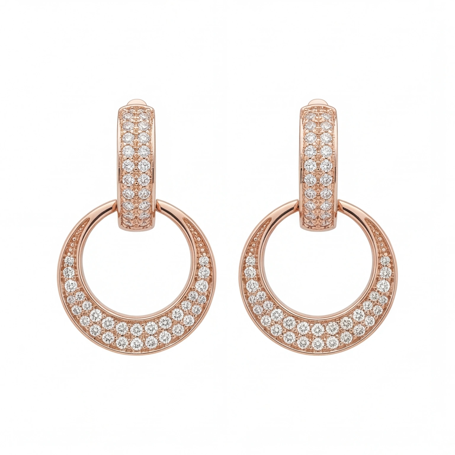 A chunky pavΓ© huggie hoop holds a large open circle; both fully set with round CZs in warm rose gold. The Full Circle Drops are bold, architectural, and completely glamorous. The earring that makes your whole face catch the light. Wear them when you mean it.
