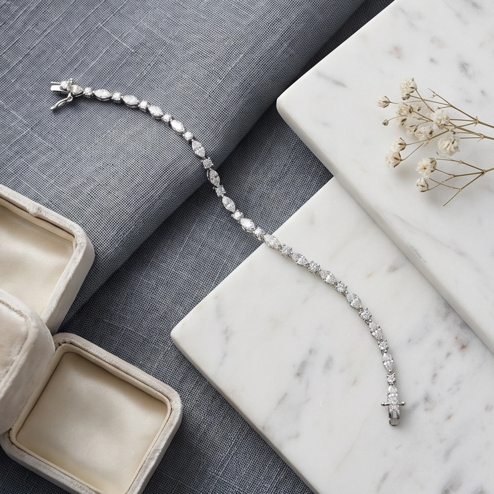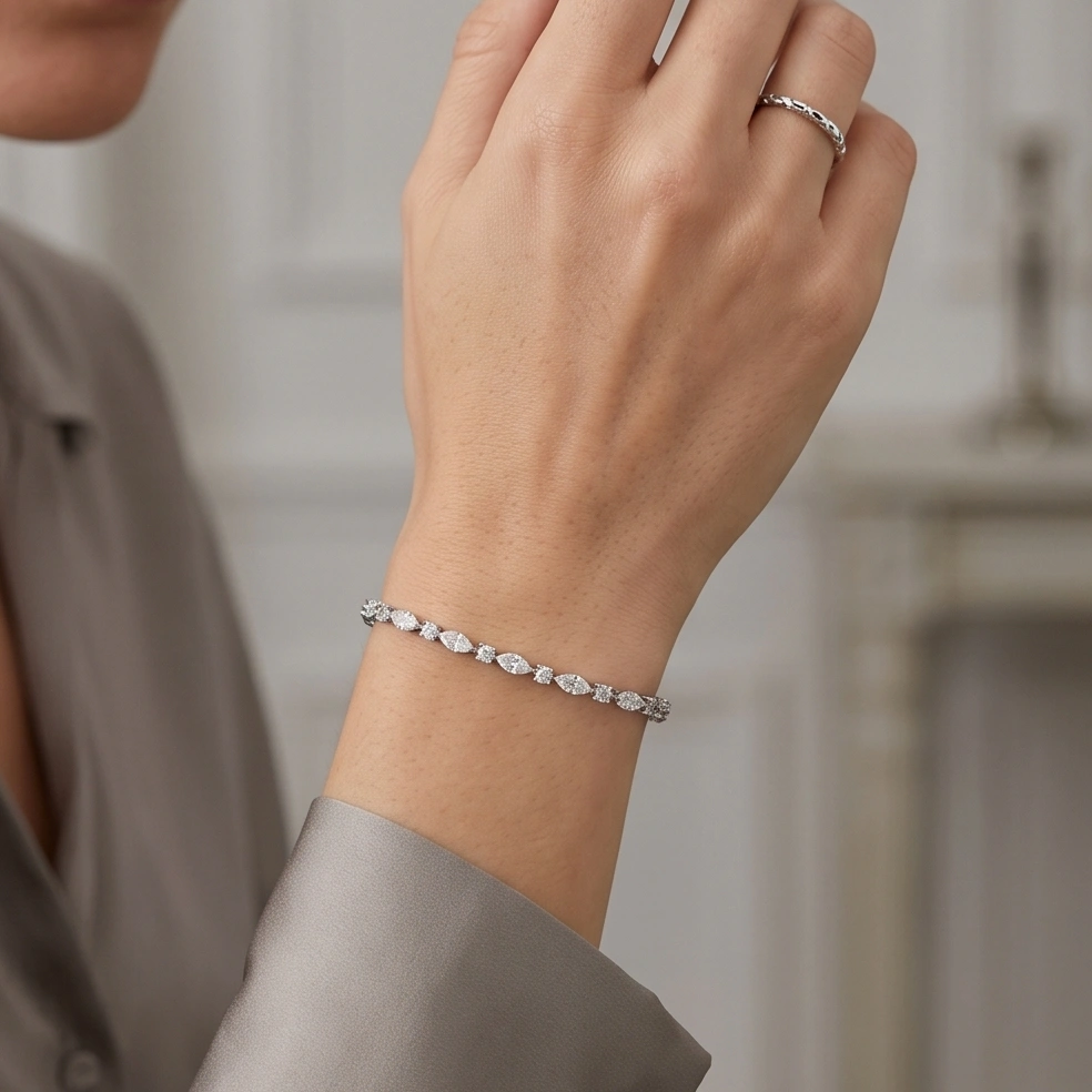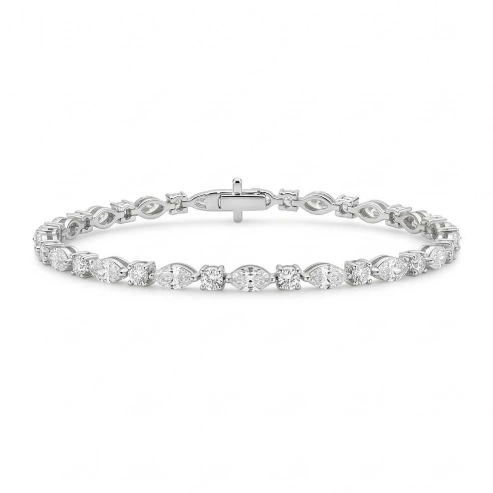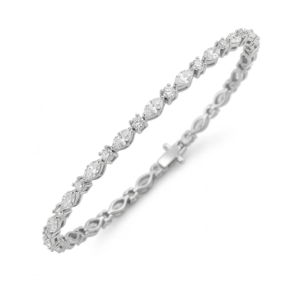 A full-circle tennis bracelet set with alternating marquise and round stones, each one catching the light differently as your wrist moves. The marquise cuts bring direction, the rounds bring softness, together they create something that feels less like a bracelet and more like a second skin.