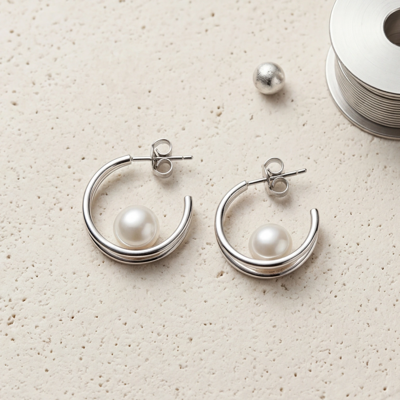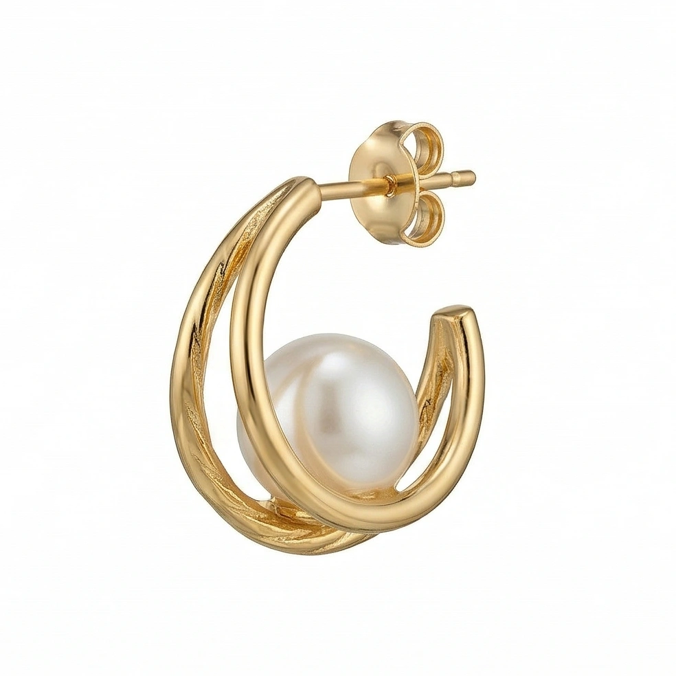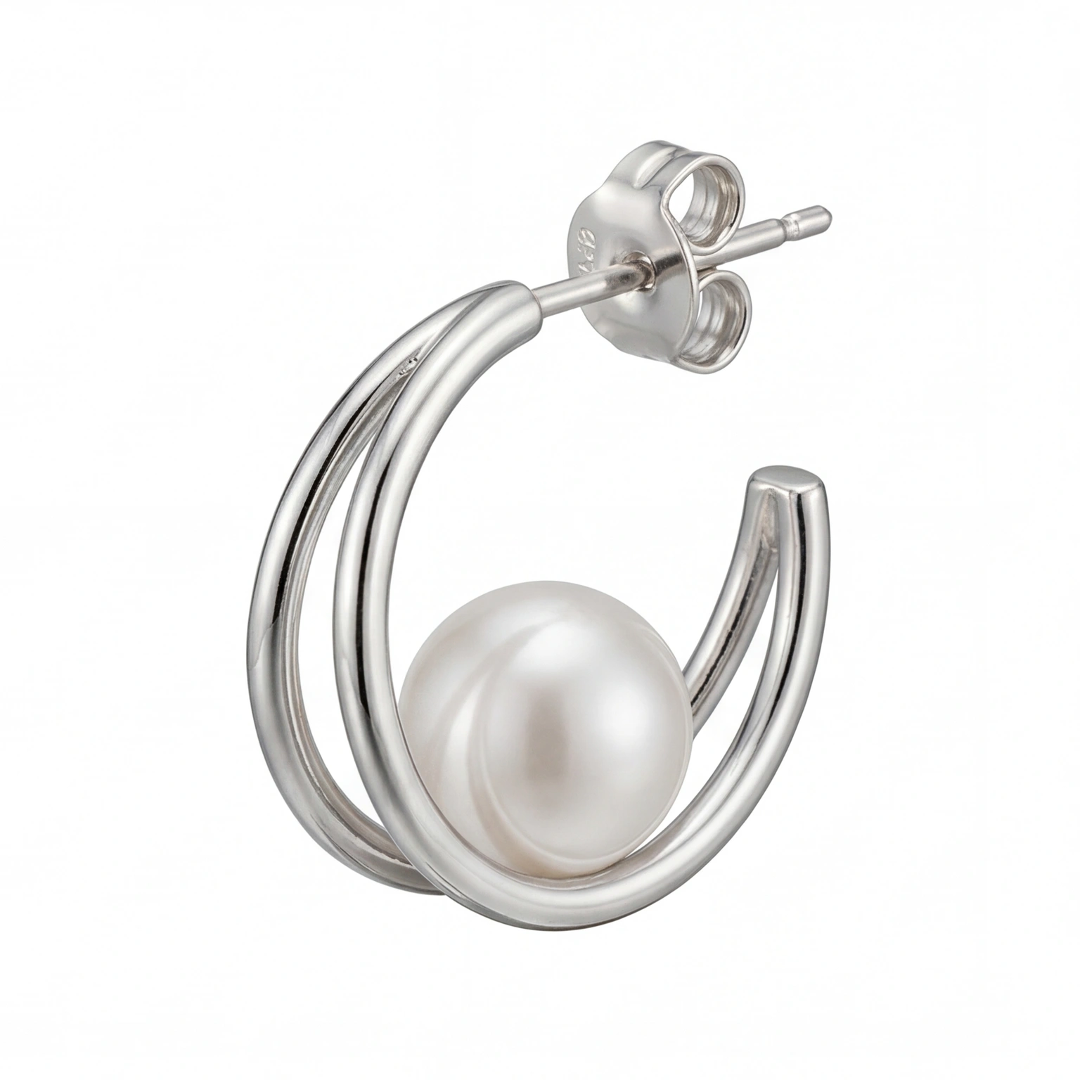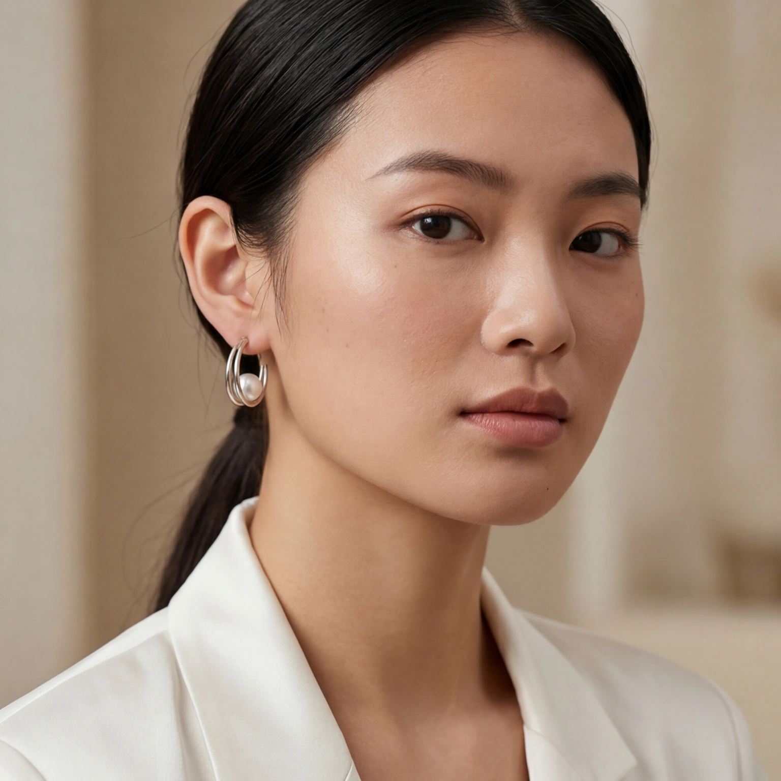 A clean open hoop cradles a single round pearl at its base β€” where geometry meets grace. The Moon & Pearl is the earring for the woman who finds beauty in restraint. Minimal, modern, and quietly timeless. The one you wear when everything else is too much.