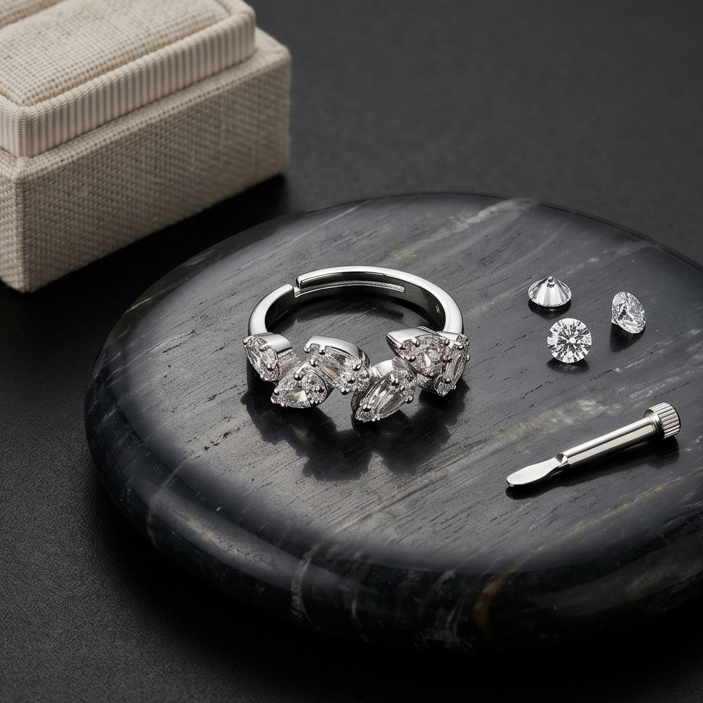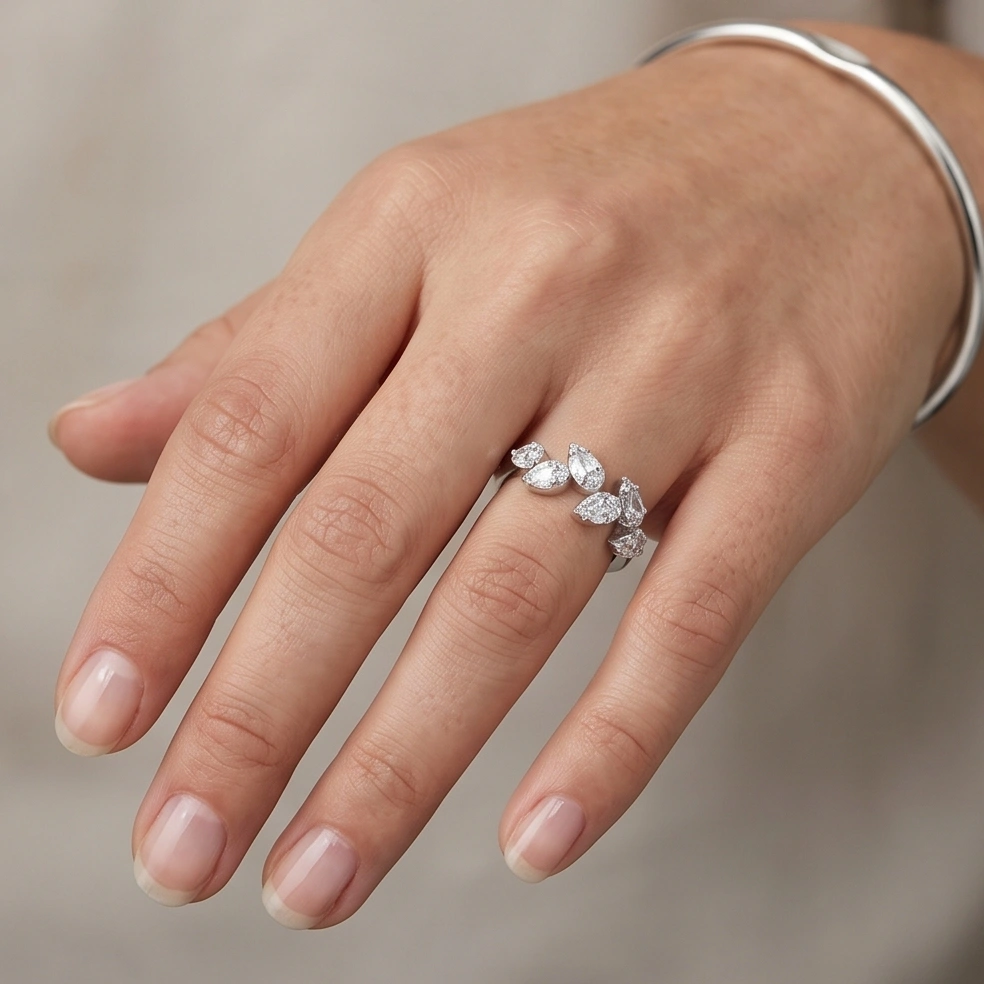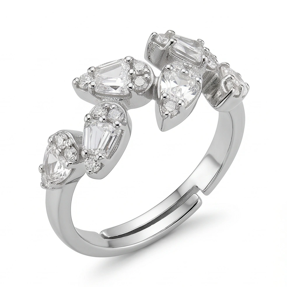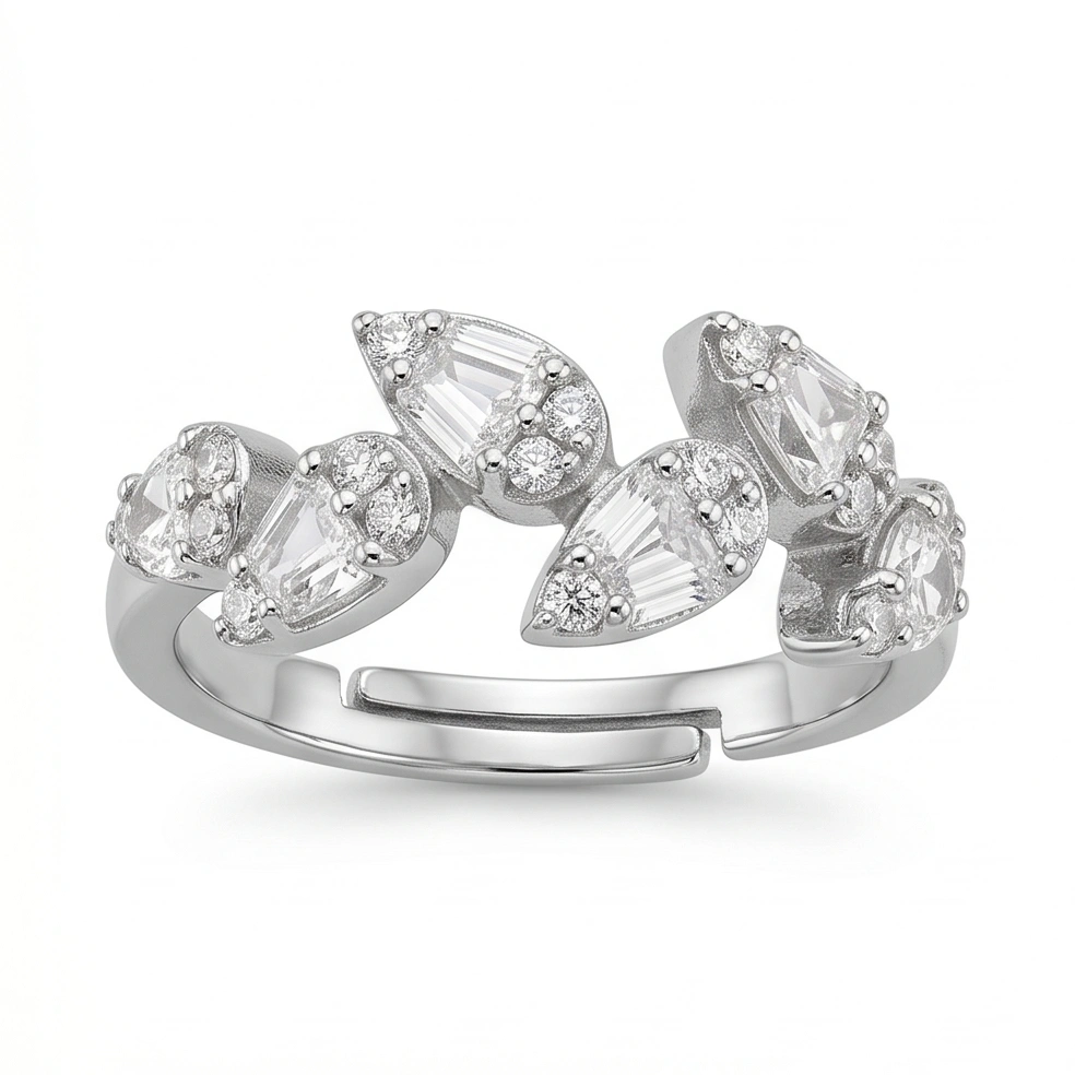 An open-band ring shaped like a scatter of baguette-and-round leaves. Adjustable fit, organic silhouette. Feels like you found it, not bought it.