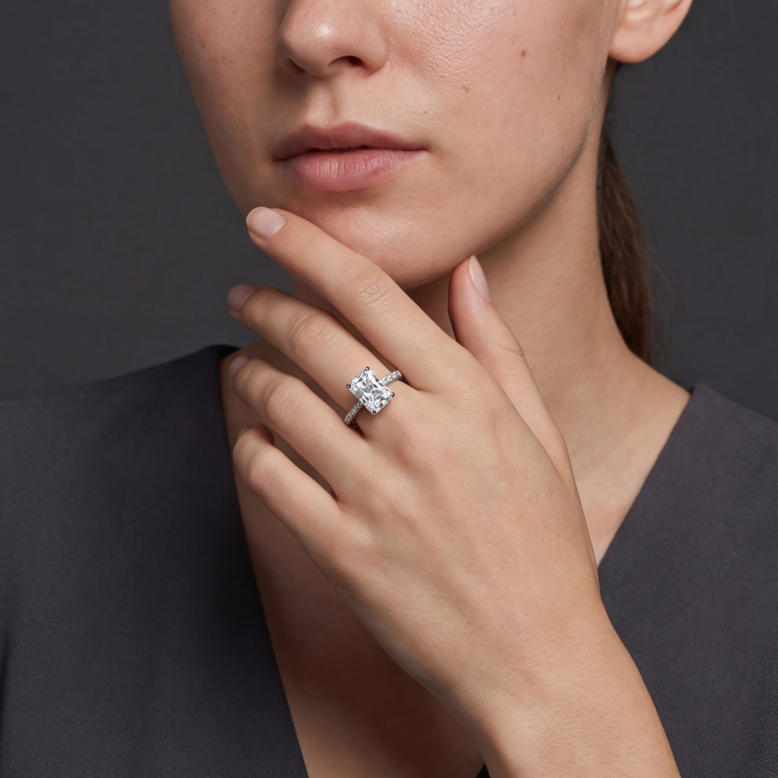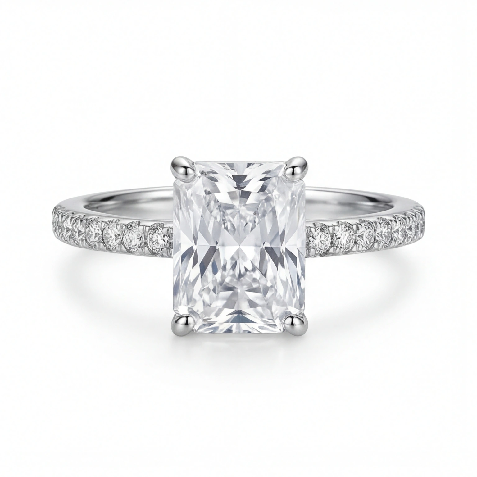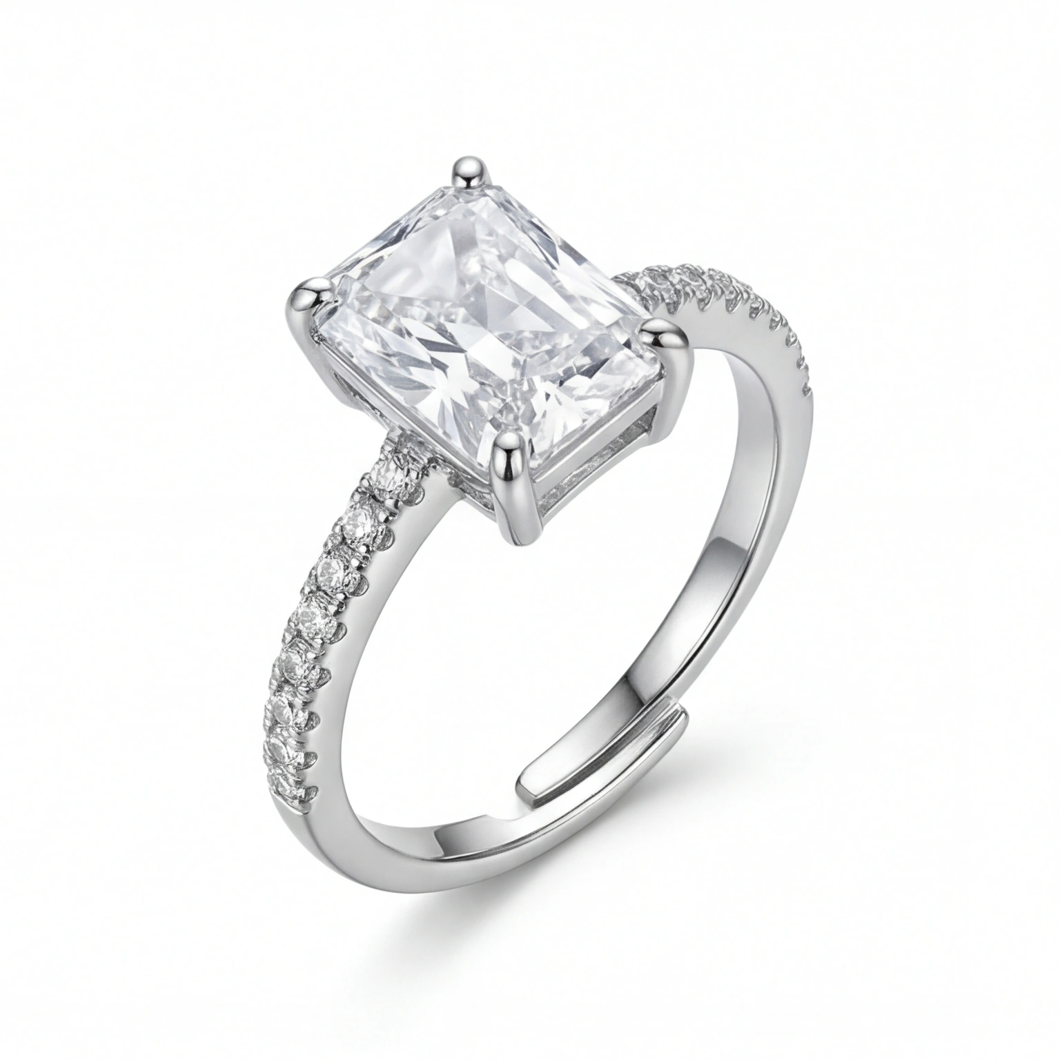 A bold radiant-cut CZ in a clean four-prong setting, elevated on a pavΓ©-lined band that trails light all the way around. The Radiant One is the ring that means something β structured, bright, and completely unforgettable. For the woman who knows exactly what she wants and isn’t afraid to wear it.