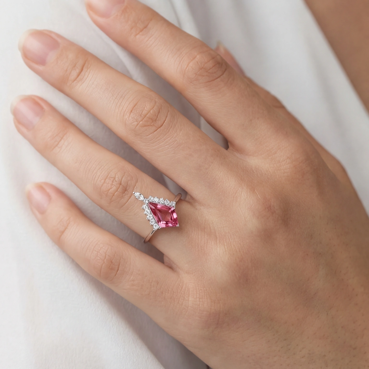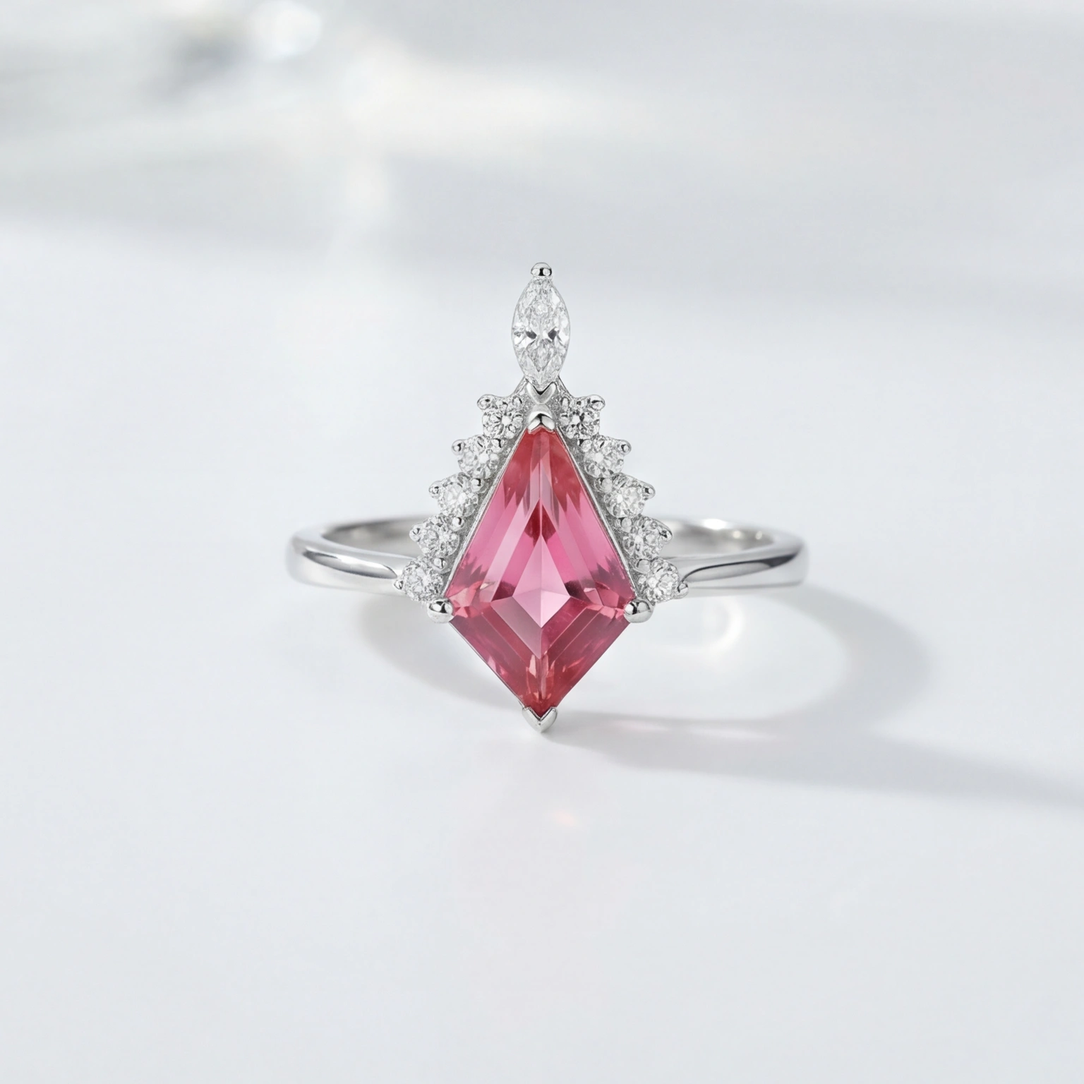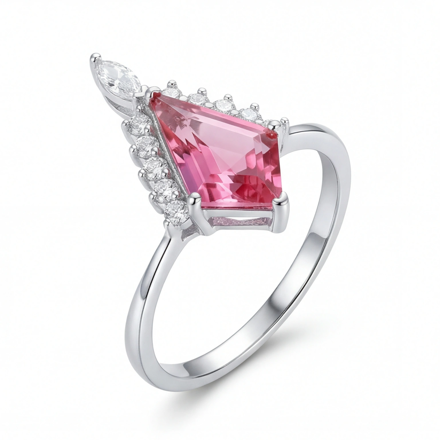 A kite-cut pink stone rises to a crown of round CZs and a marquise accent at the peak; regal, dramatic, and completely its own. The Rose Reign is not for the background. It’s for the woman who walks in and the room adjusts. Statement jewellery that still knows how to be graceful.