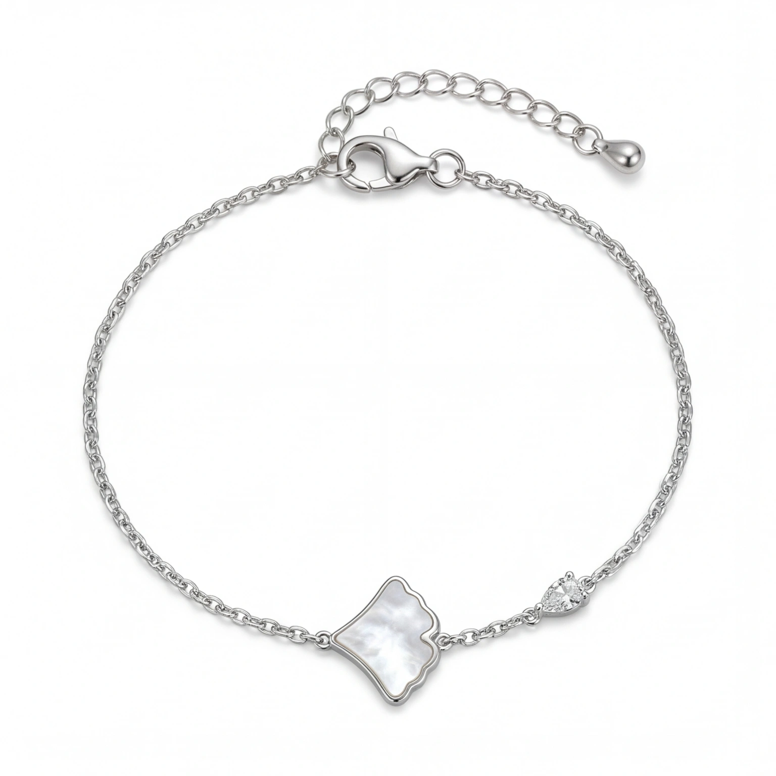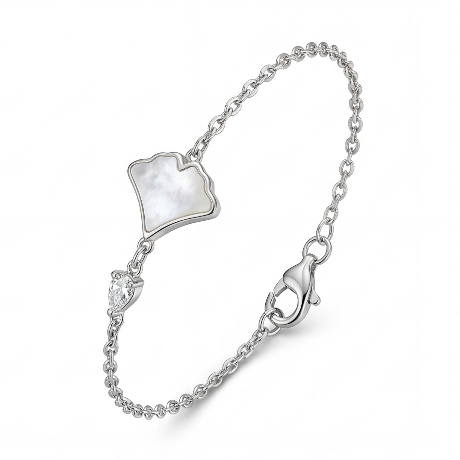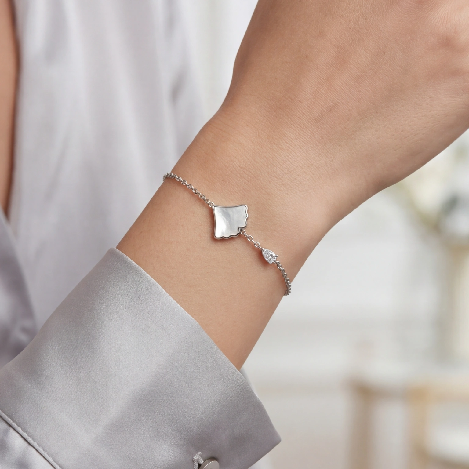 A single cloud-shaped mother of pearl tile sits beside a lone pear-cut CZ β two textures in conversation on a silver cable chain. The Nacar doesn’t rush to impress. It arrives softly, like light through an overcast sky, and stays with you long after you’ve noticed it. For the woman who collects beautiful things quietly.