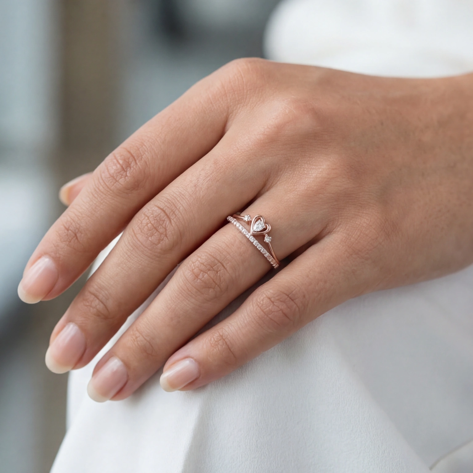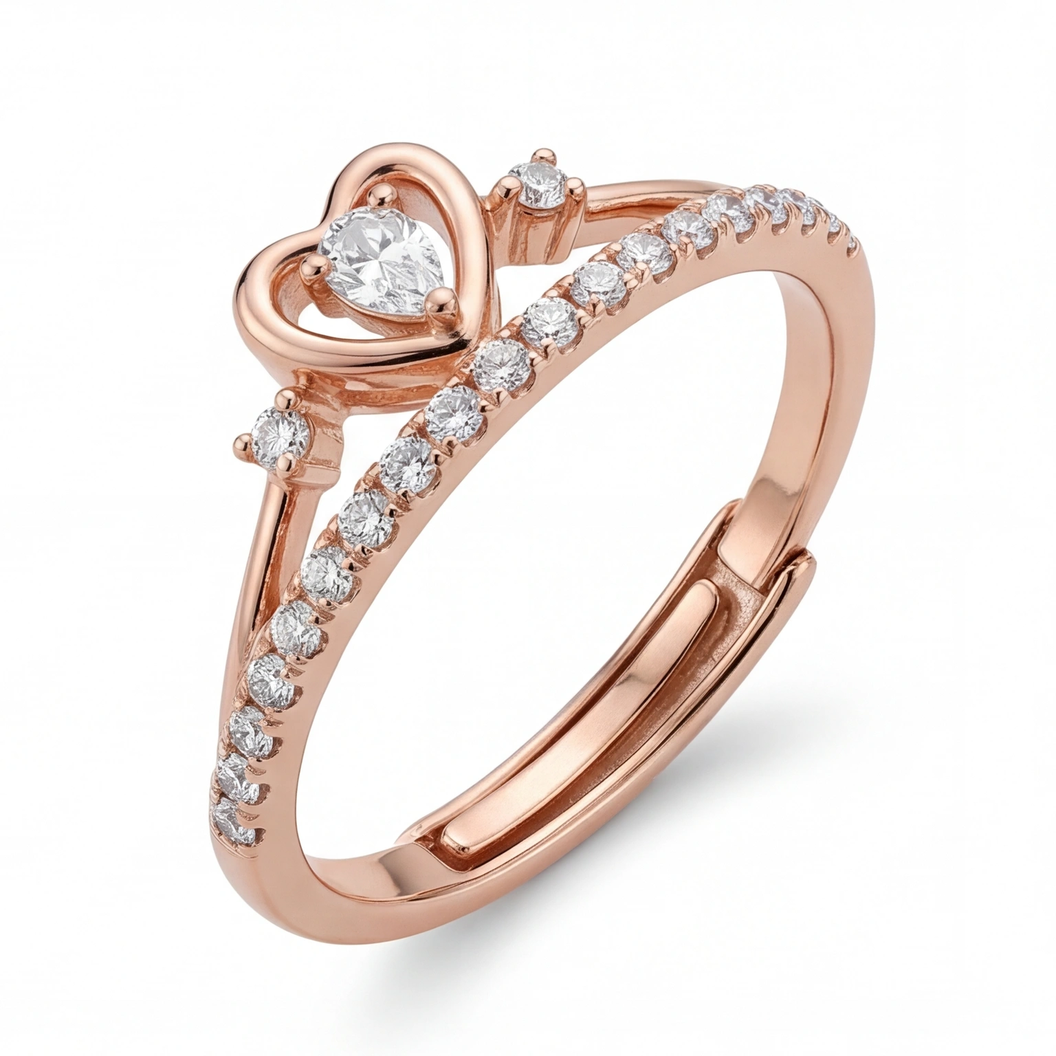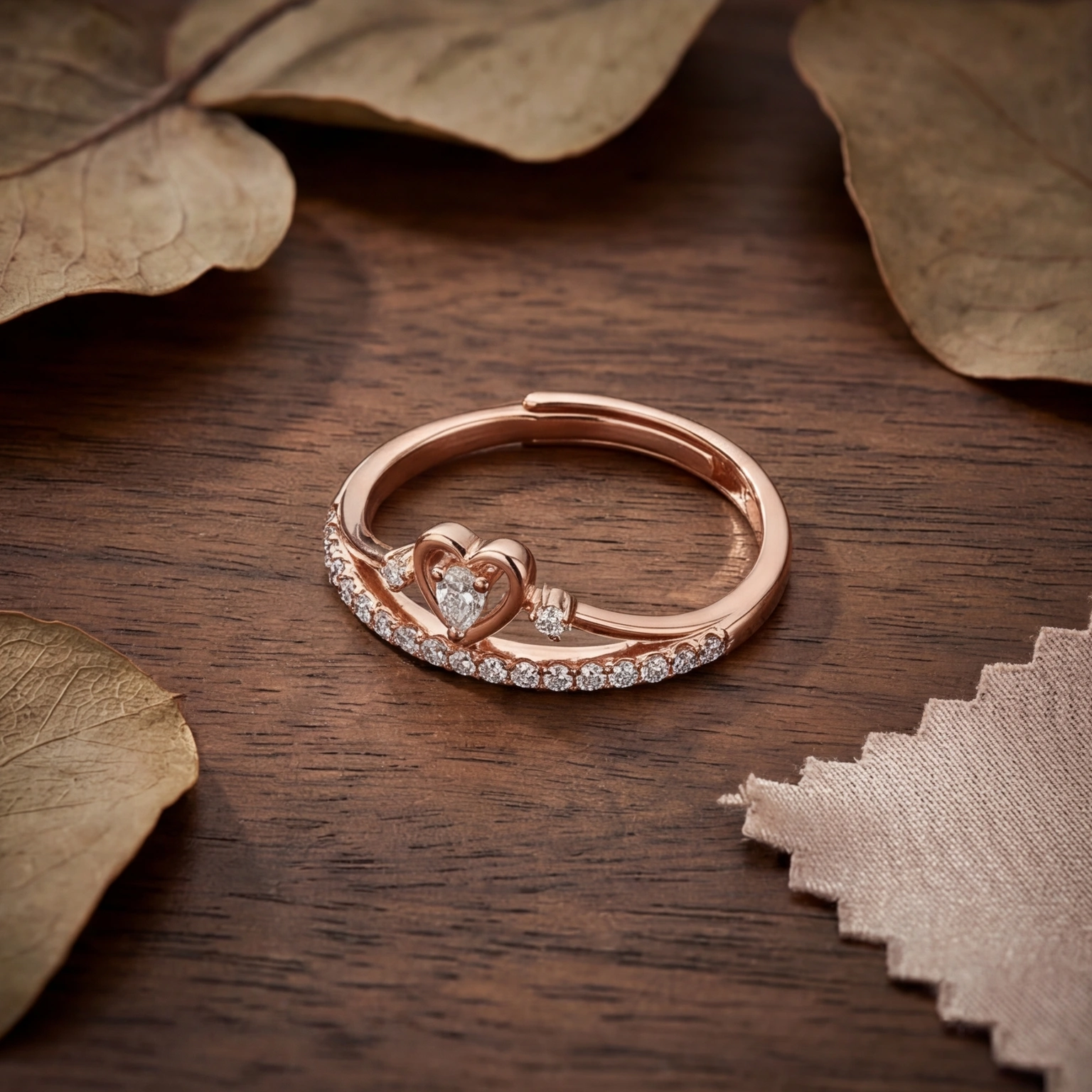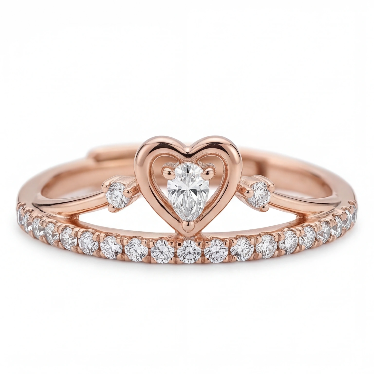 A rose gold open-ended ring where a dainty heart frame holds a pear-cut CZ at its centre, flanked by two accent stones, all sitting above a half-eternity pavΓ© band. The Tender Crown is adjustable, romantic, and quietly royal. The kind of ring you gift to someone you mean it with β or buy for yourself, because you do.