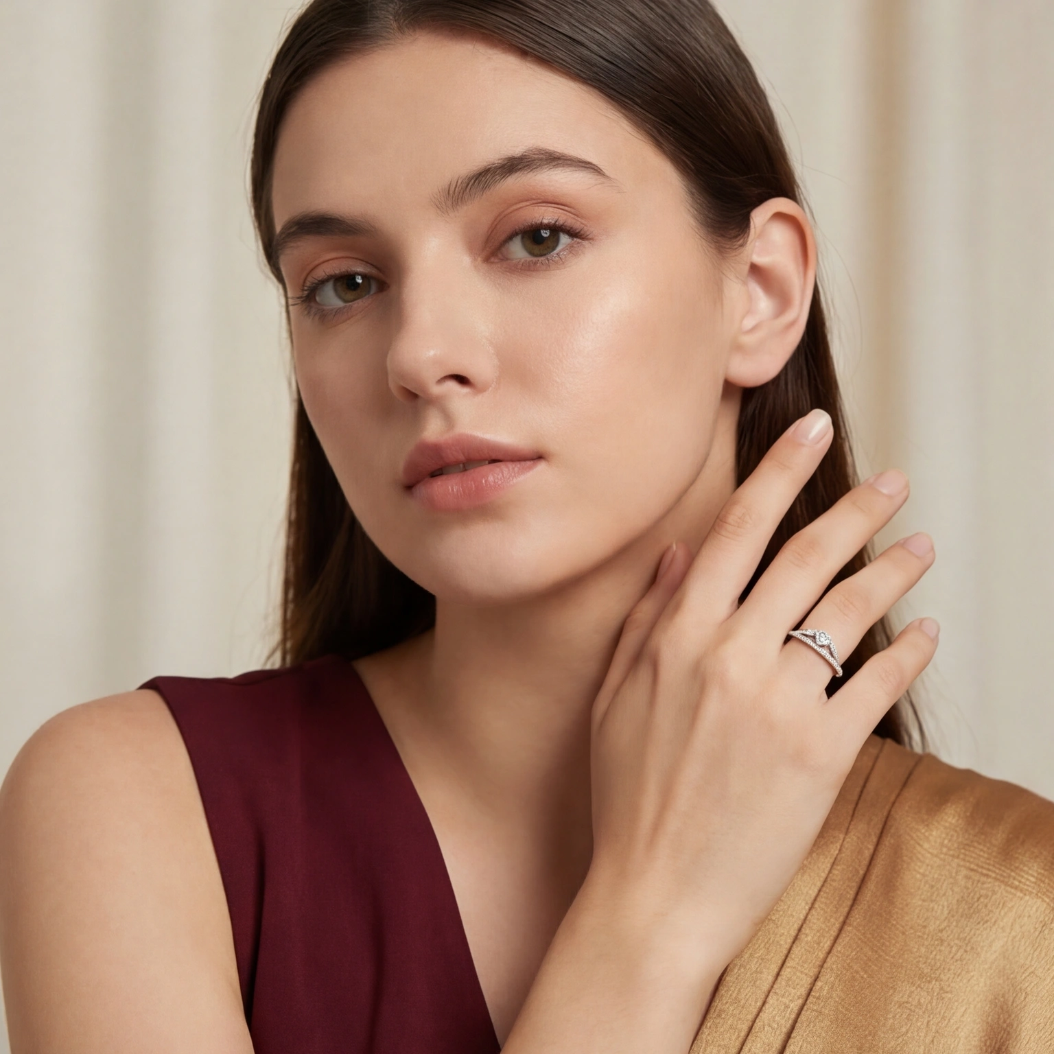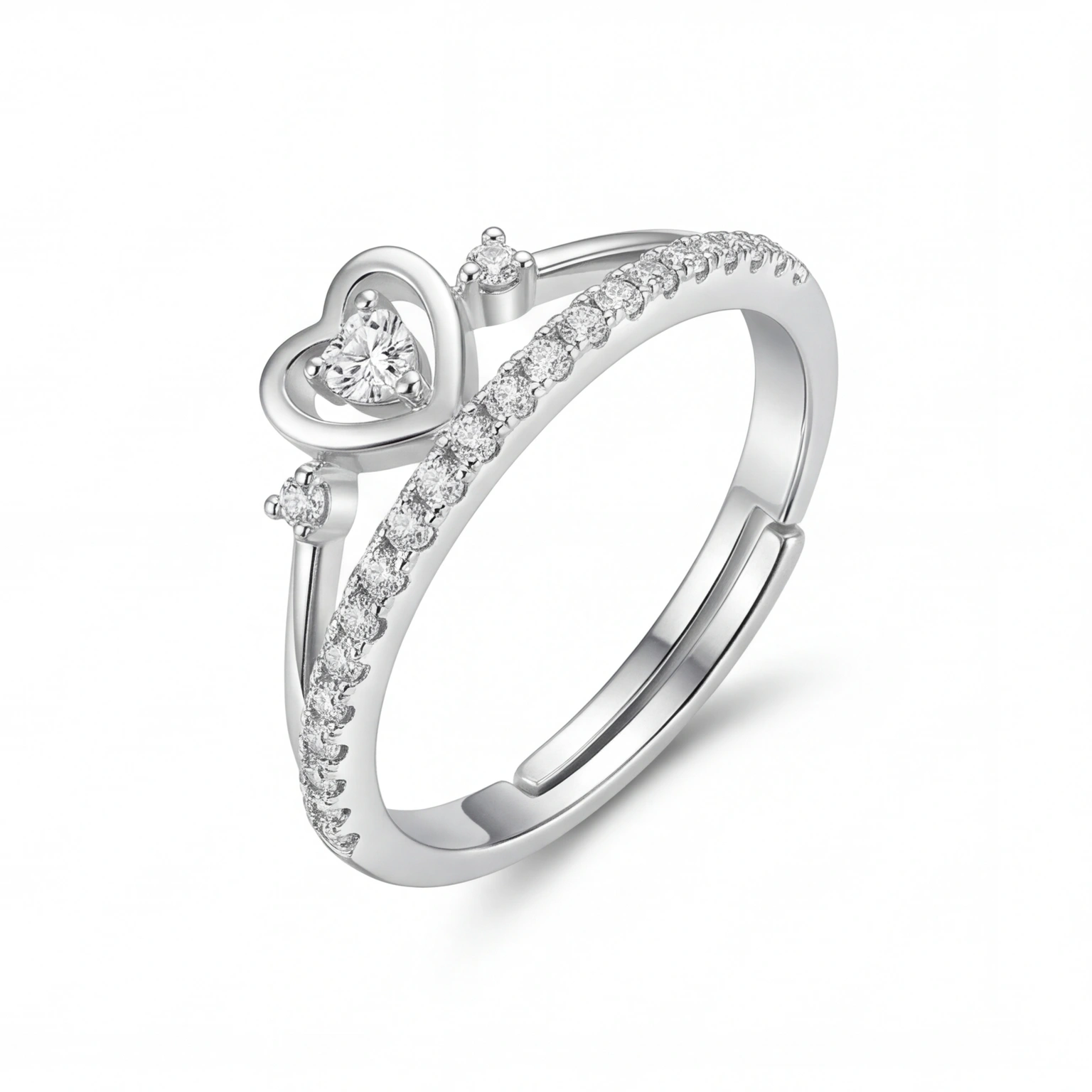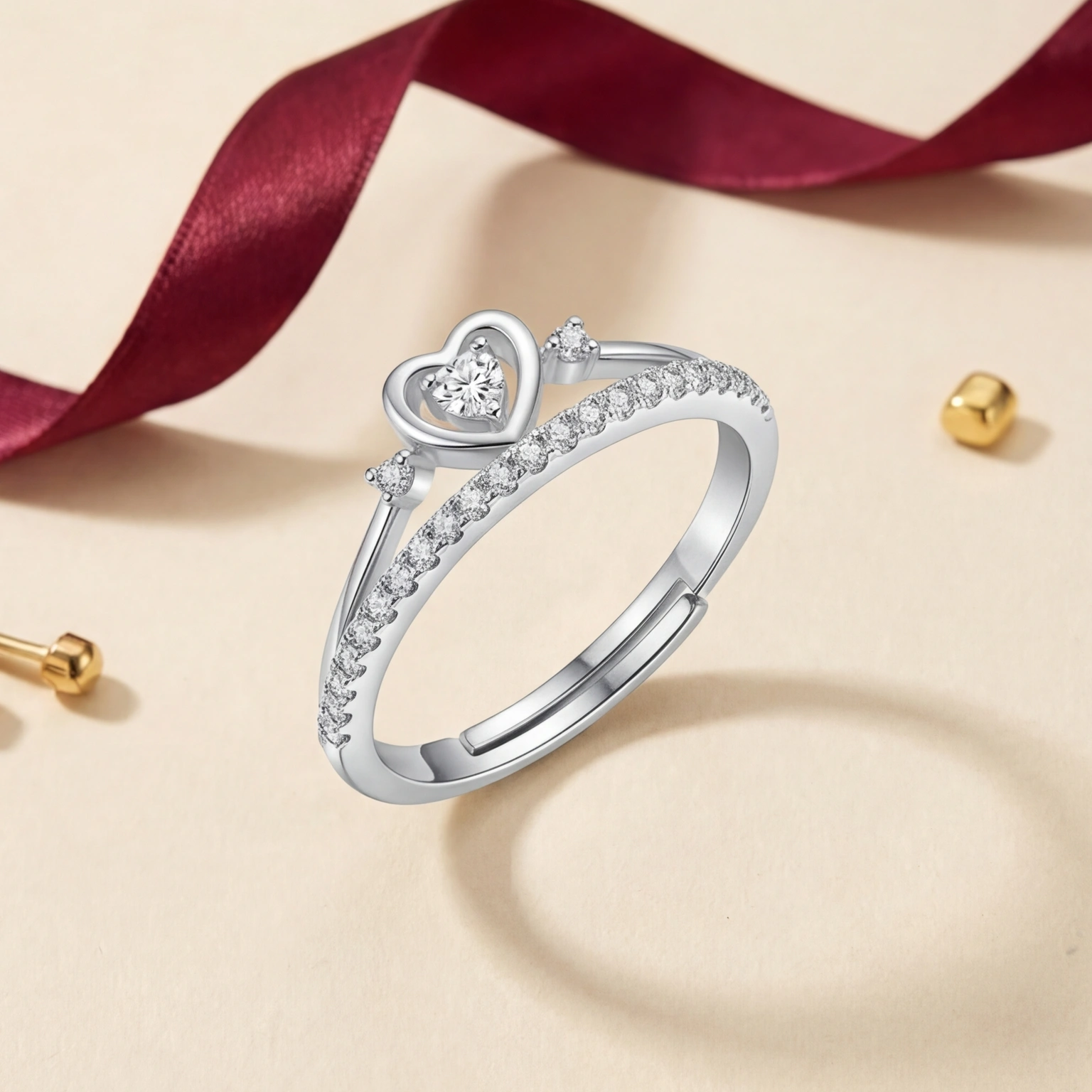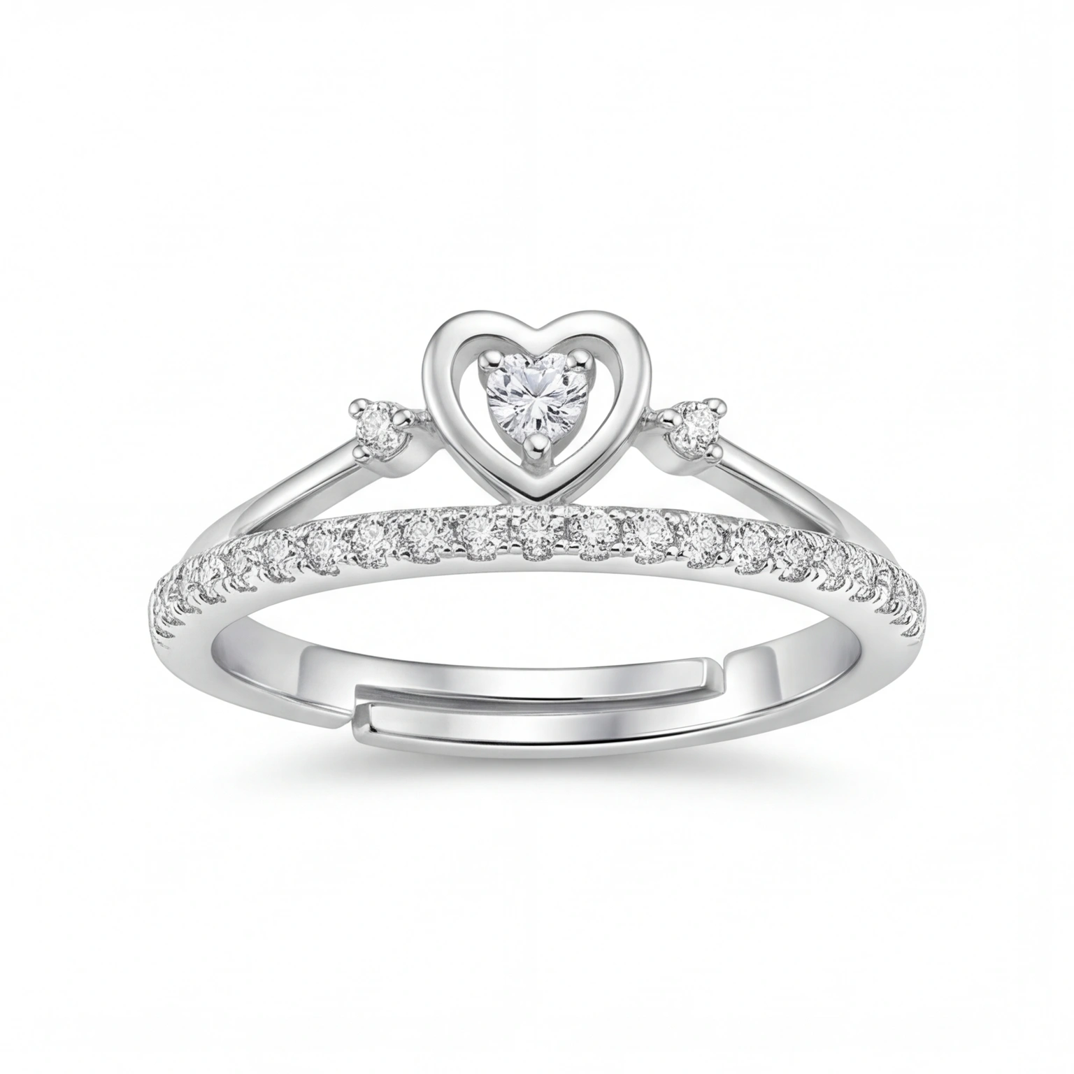 A rose gold open-ended ring where a dainty heart frame holds a pear-cut CZ at its centre, flanked by two accent stones, all sitting above a half-eternity pavΓ© band. The Tender Crown is adjustable, romantic, and quietly royal. The kind of ring you gift to someone you mean it with β or buy for yourself, because you do.