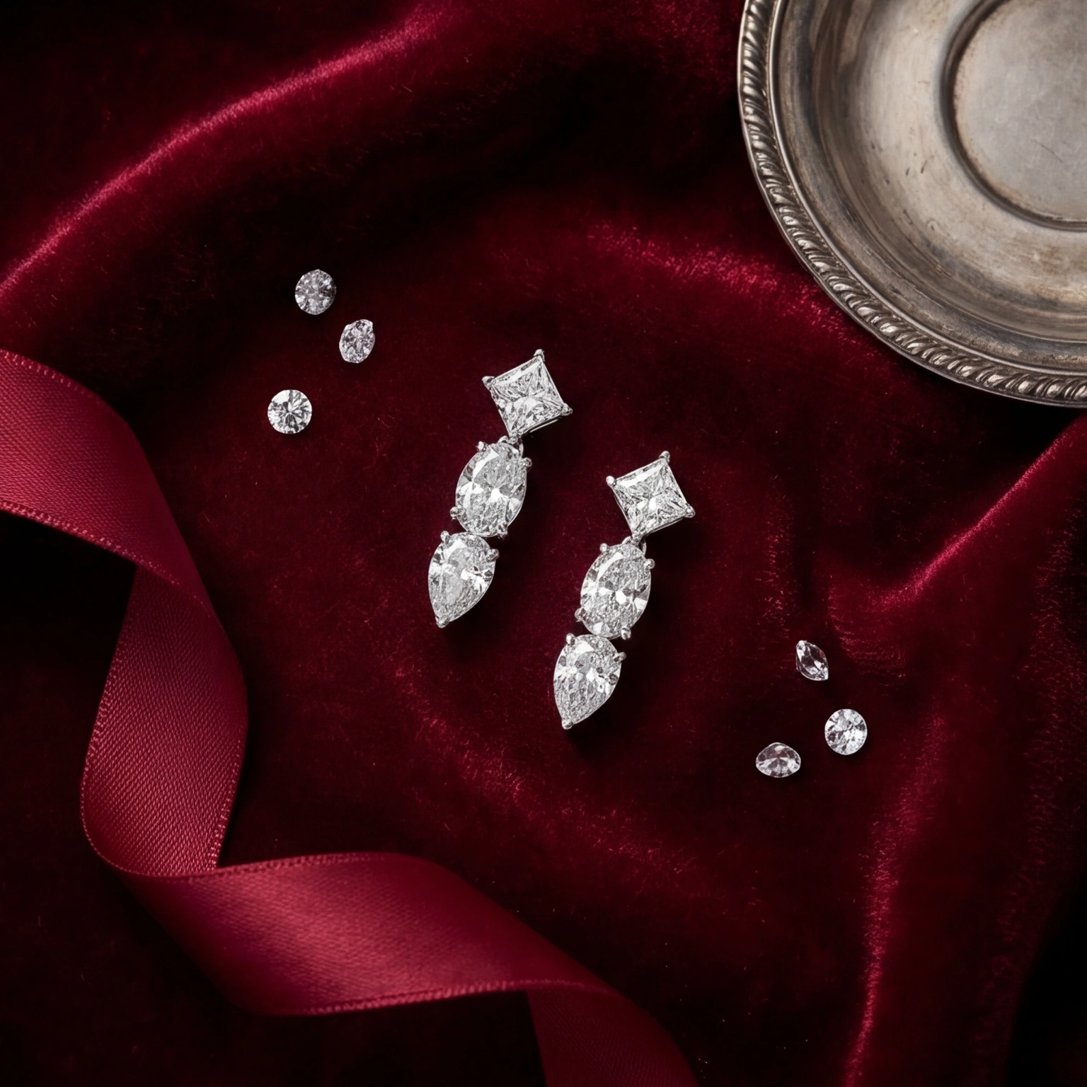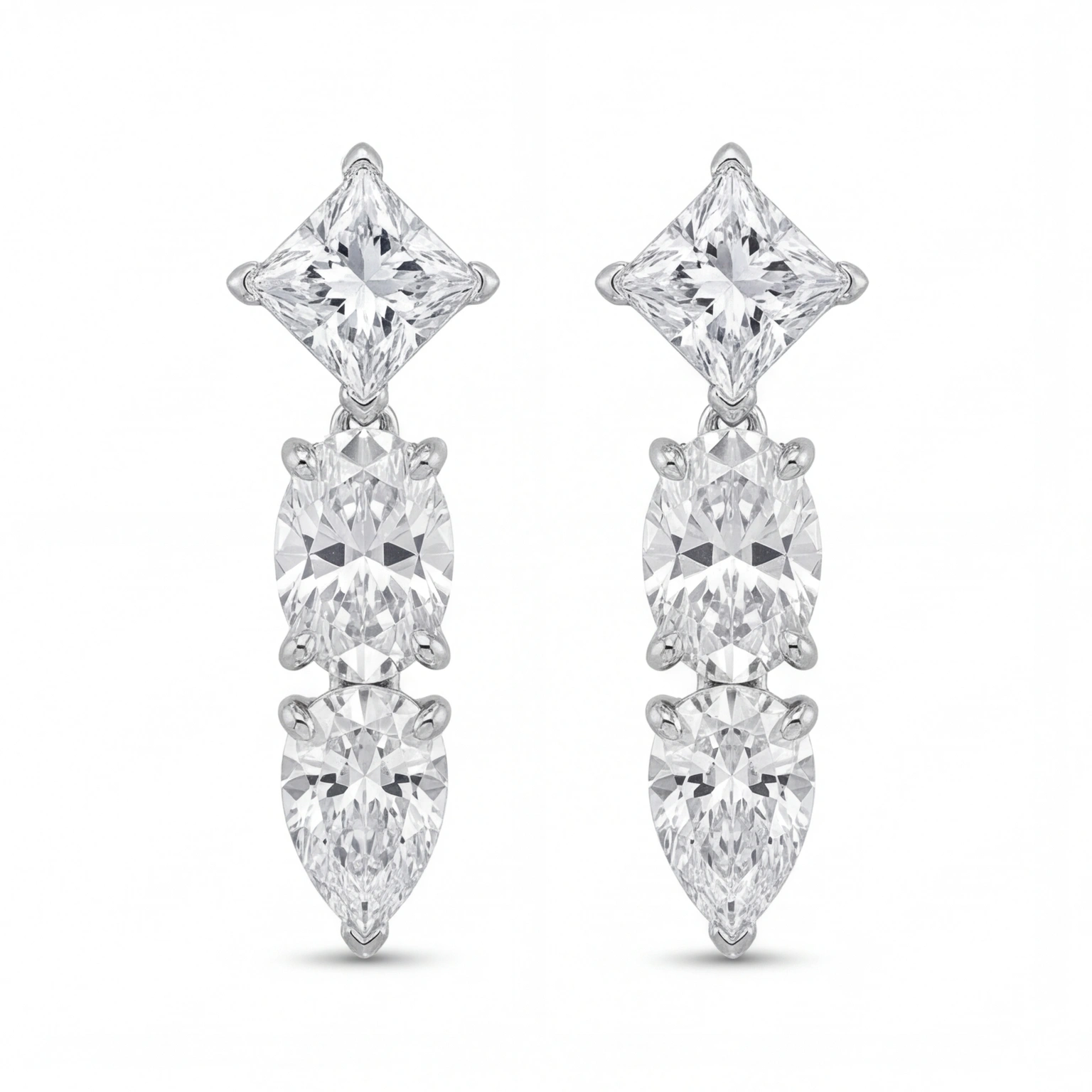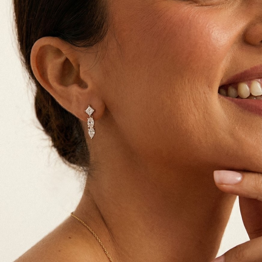 A princess-cut stud anchors a flowing drop of marquise and pear-cut CZs, each stone a different shape, all telling the same luminous story. The Three Stone Drops move when you move, catch light when you don’t expect it, and make every outfit feel like an occasion.