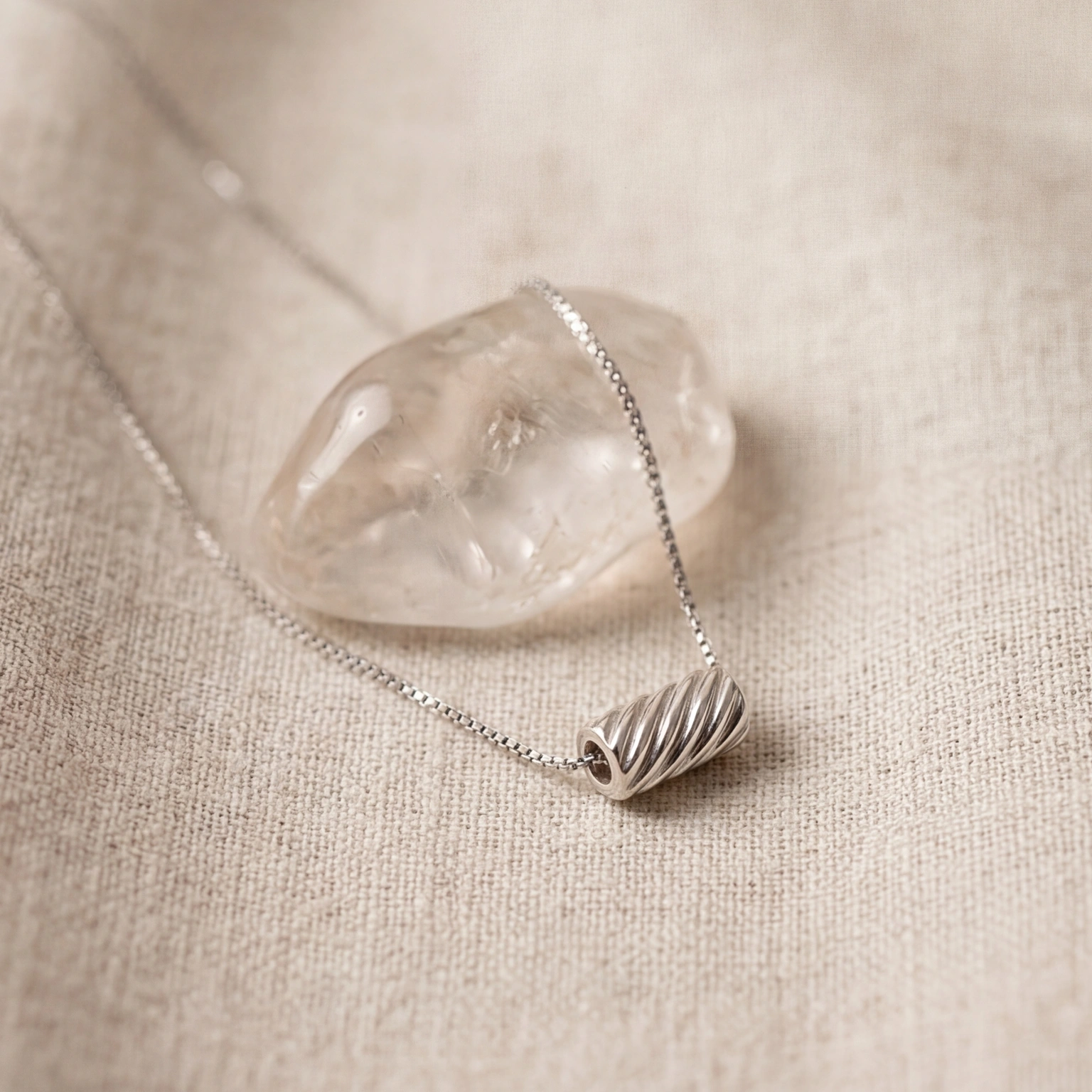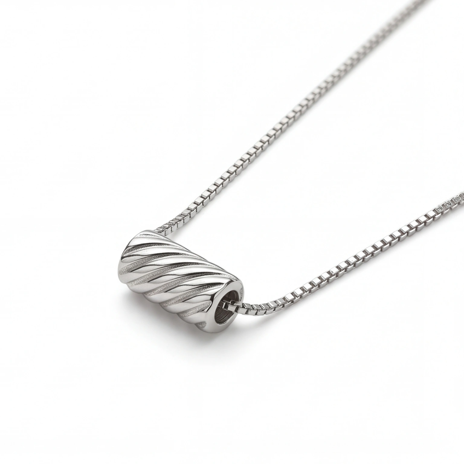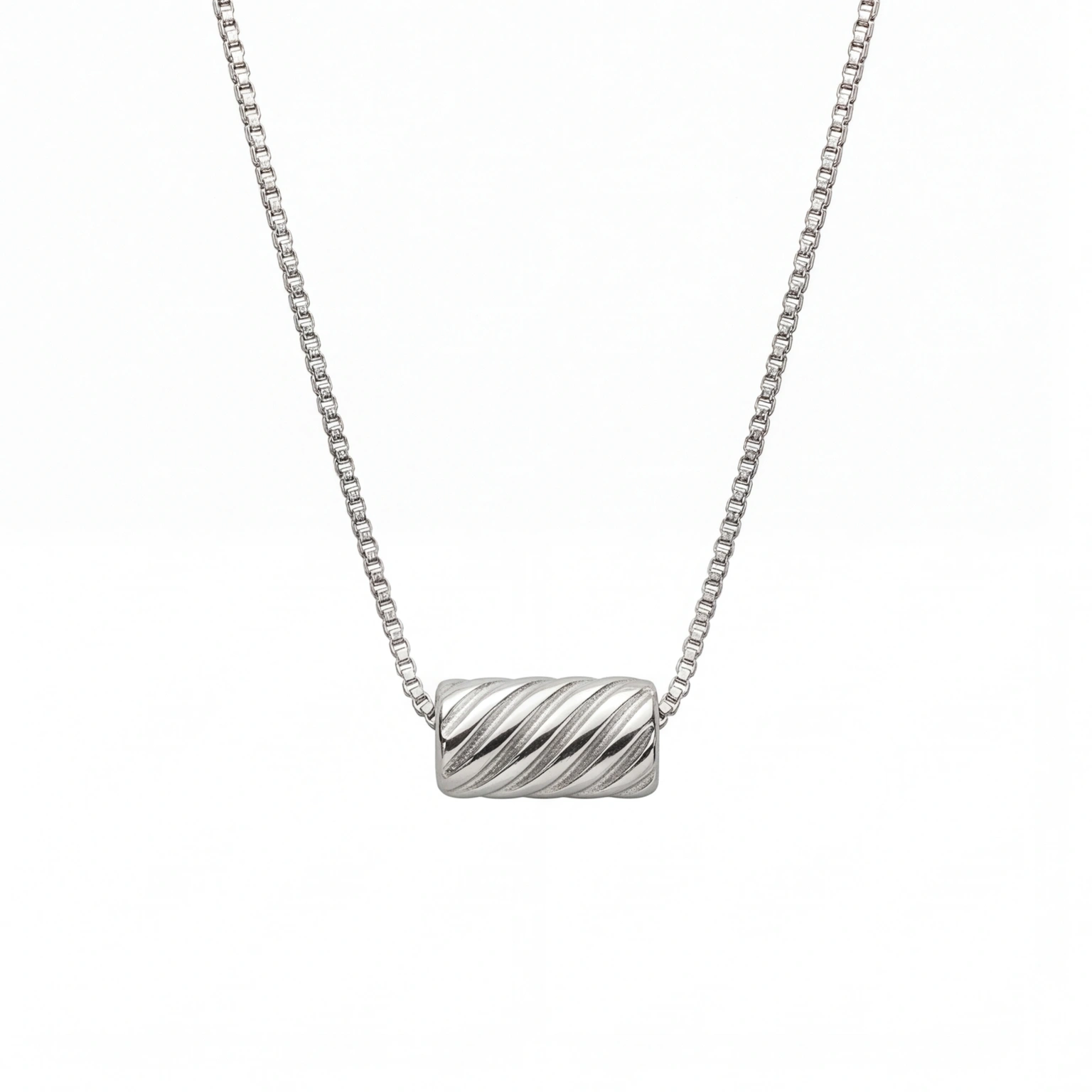 A ridged barrel bead threaded directly onto a sleek box chain β no clasp, no fuss, just one sculptural piece that slides and settles right at the collarbone. The Twist Pendant is minimal in the most considered way. For the woman who finds beauty in form, not flash.