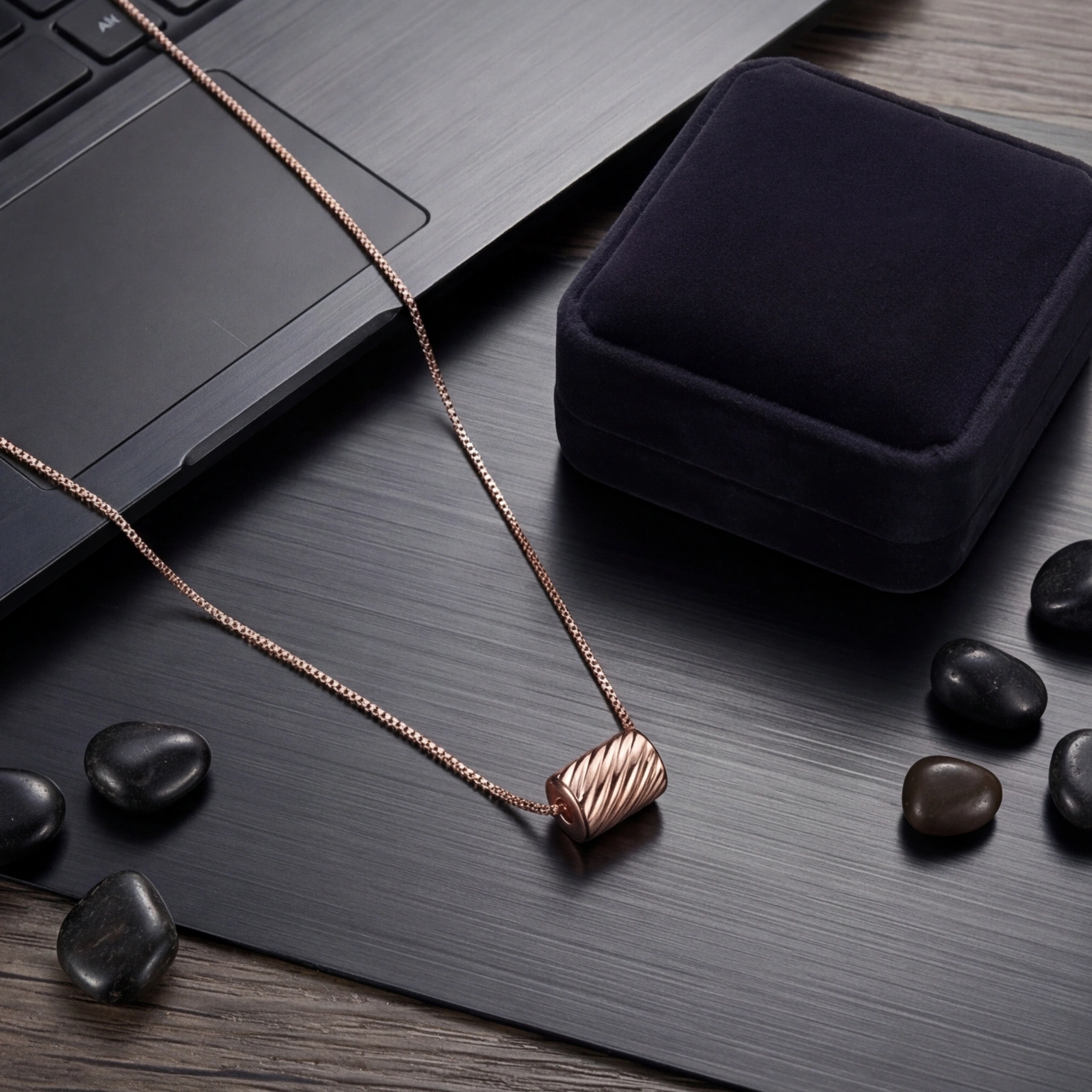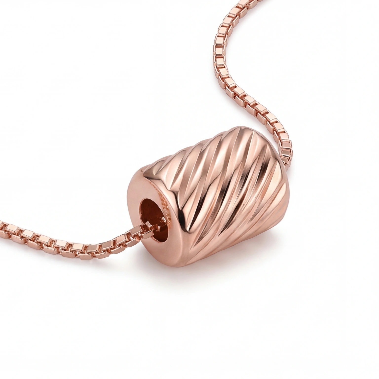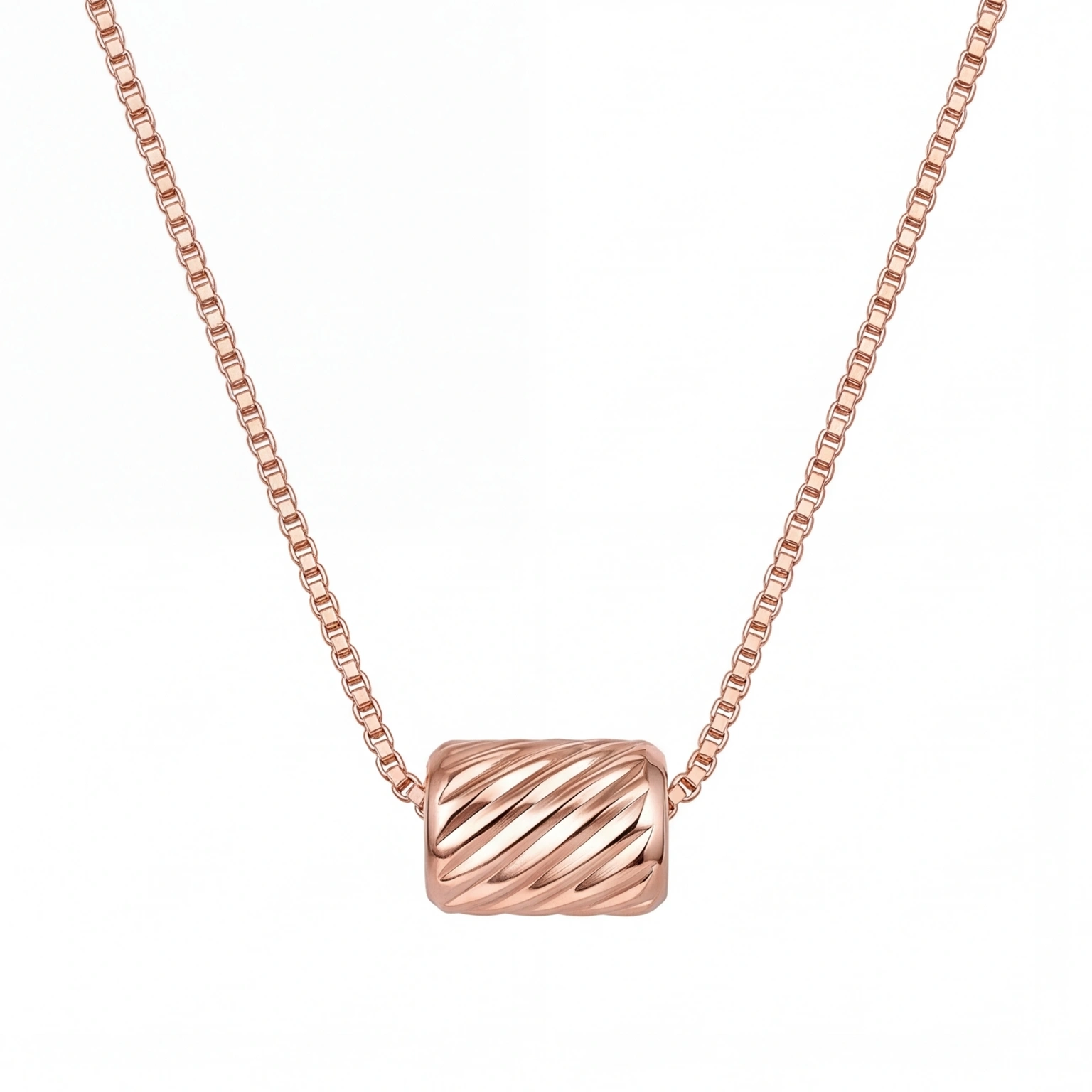 A ridged barrel bead threaded directly onto a sleek box chain β no clasp, no fuss, just one sculptural piece that slides and settles right at the collarbone. The Twist Pendant is minimal in the most considered way. For the woman who finds beauty in form, not flash.